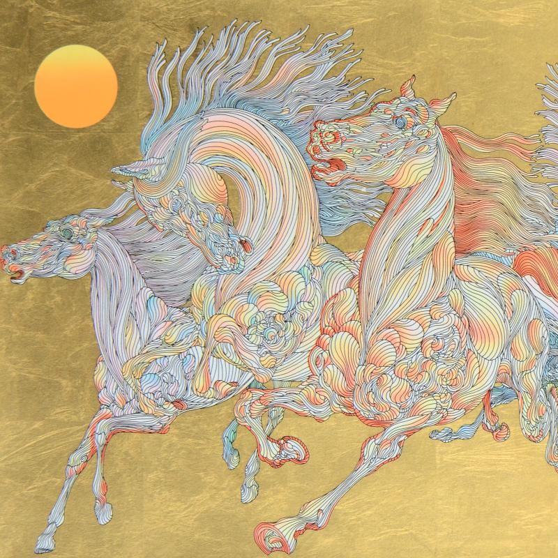 "Lever De Soleil" is a limited edition serigraph on paper with hand laid gold leaf by Guillaume Azoulay, numbered and hand signed by the artist. Includes Certificate of Authenticity! Measures approx. 38" x 27.5" (border)., 32" x 21" (image).