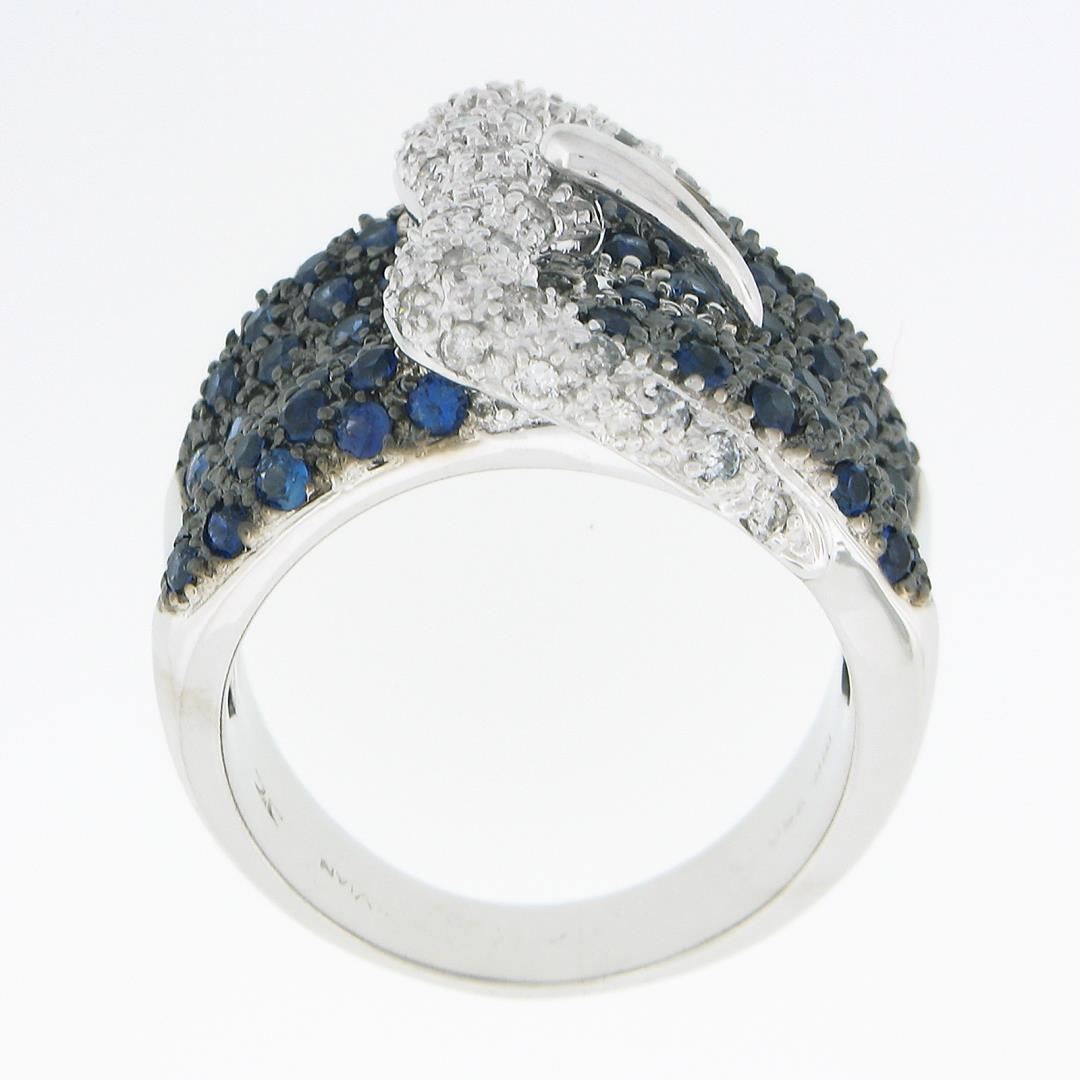 A solid 18k white gold buckle ring by Levian, with 33 round brilliant cut natural diamonds (G/H - I1/I2 ; 0.30ctw), and 67 round brilliant cut natural sapphires (Vibrant Blue Color - 1.50ctw). The ring is size 6.5, weighs a total of 13.74 grams, and measures 18.4mm wide.
