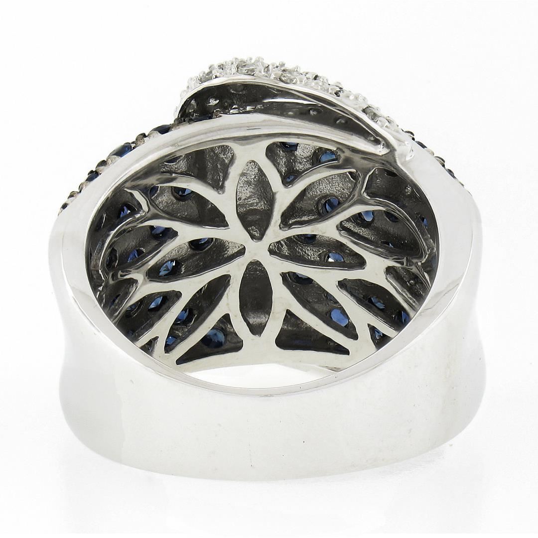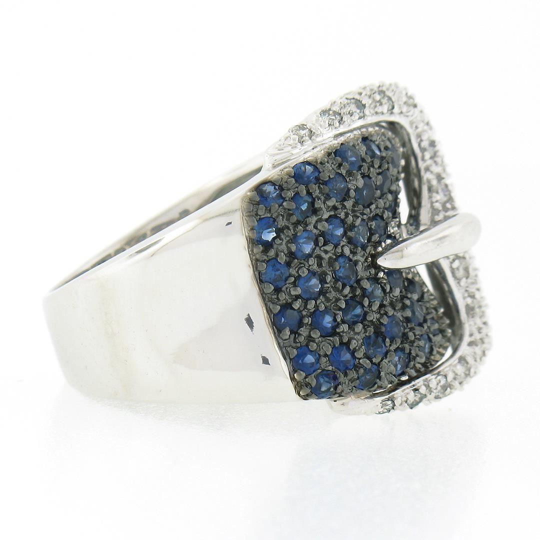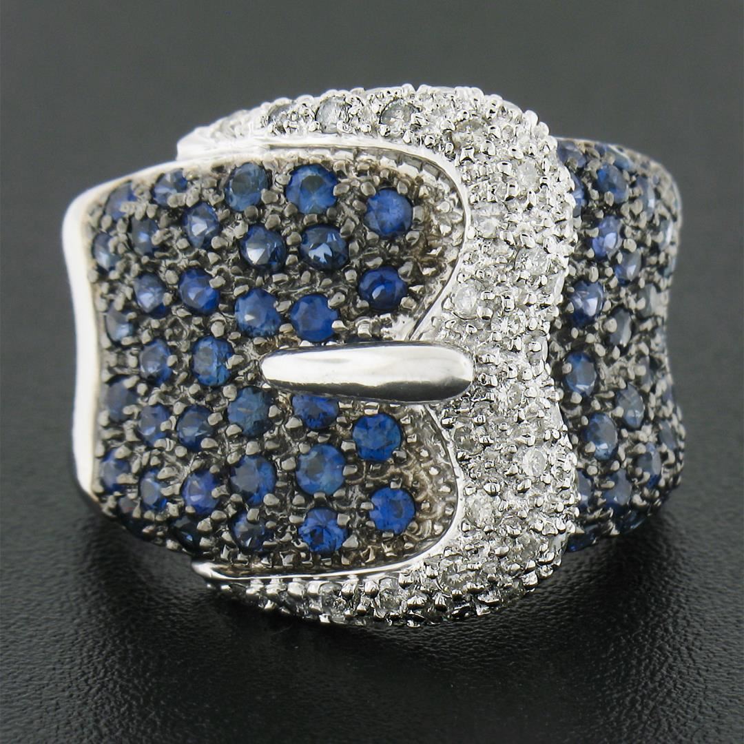 A solid 18k white gold buckle ring by Levian, with 33 round brilliant cut natural diamonds (G/H - I1/I2 ; 0.30ctw), and 67 round brilliant cut natural sapphires (Vibrant Blue Color - 1.50ctw). The ring is size 6.5, weighs a total of 13.74 grams, and measures 18.4mm wide.