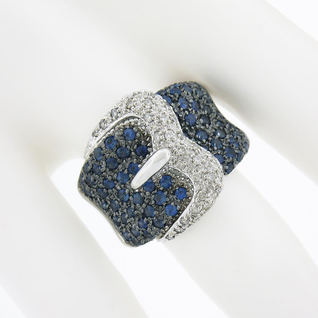 A solid 18k white gold buckle ring by Levian, with 33 round brilliant cut natural diamonds (G/H - I1/I2 ; 0.30ctw), and 67 round brilliant cut natural sapphires (Vibrant Blue Color - 1.50ctw). The ring is size 6.5, weighs a total of 13.74 grams, and measures 18.4mm wide.