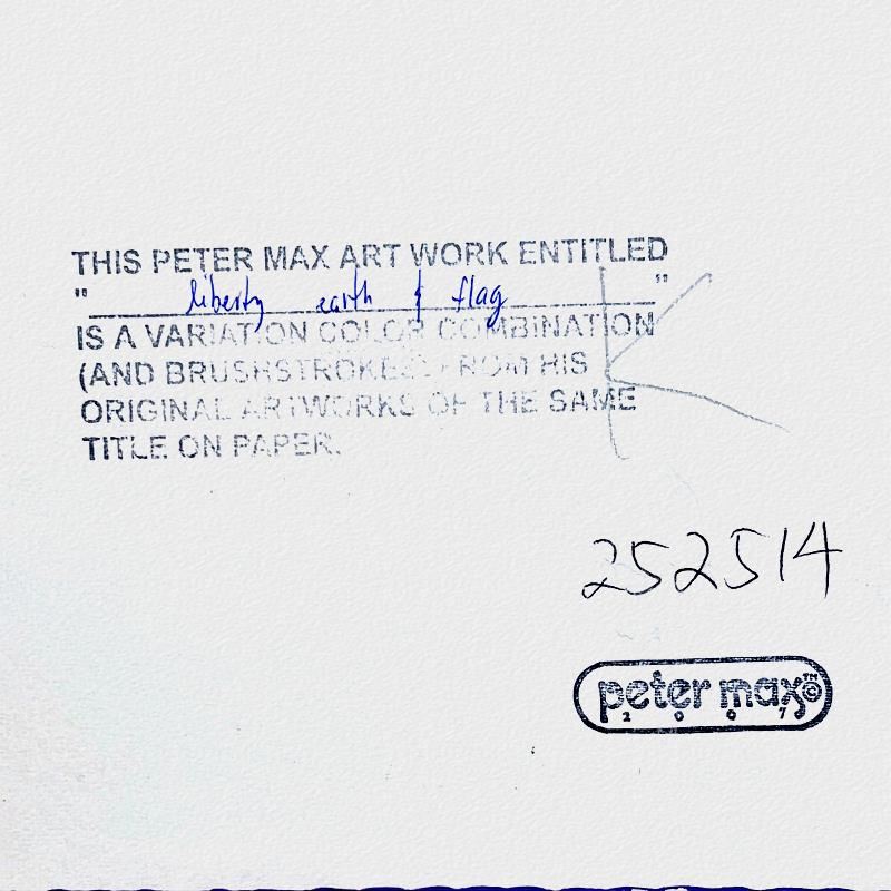 "Liberty, Earth and Flag" is a one-of-a-kind mixed media on paper, hand signed by Peter Max. The piece comes custom framed with a backside cutout to display Peter Max Studio registration number 252514 certifying authenticity. Measures approximately 28" x 24" (frame), 19" x 15" (image).