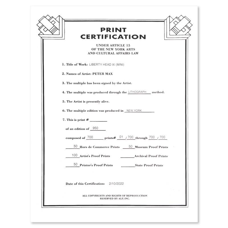 Liberty Head by Peter Max. "Liberty Head" is a limited edition lithograph on paper by Peter Max, numbered and hand signed by the artist. This piece comes framed. Includes Certificate of Authenticity from Peter Max Studios. Measures approximately 18" x 18" (frame), 7" x 7" (image). Please note: There may be minor imperfections on the frame (hairline scratches/chipping).