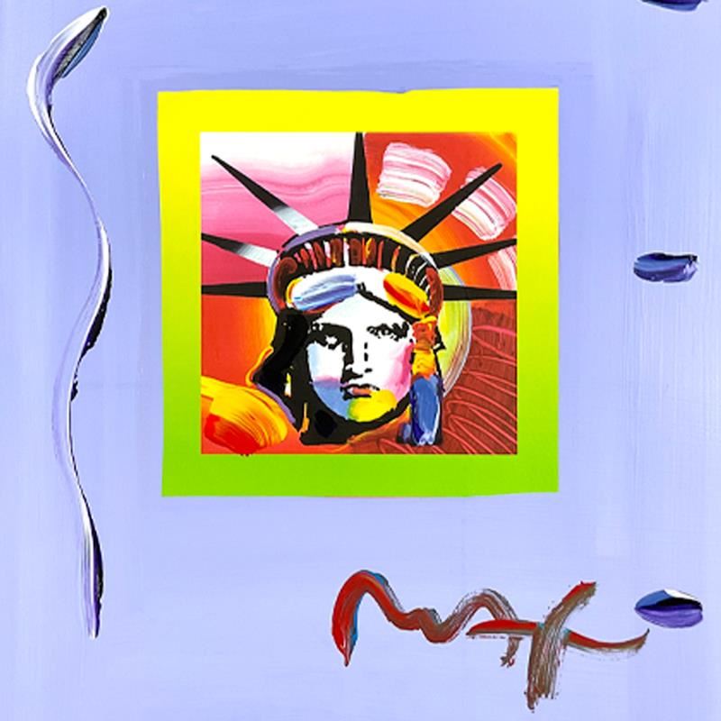 "Liberty Head" is a one-of-a-kind acrylic mixed media on paper, hand signed by Peter Max. The piece comes custom framed with a backside cutout to display Peter Max Studio registration number 159283 certifying authenticity. Measures approx. 30" x 26" (frame), 17" x 13" (image). This item requires special handling and may have a longer than usual turnaround.