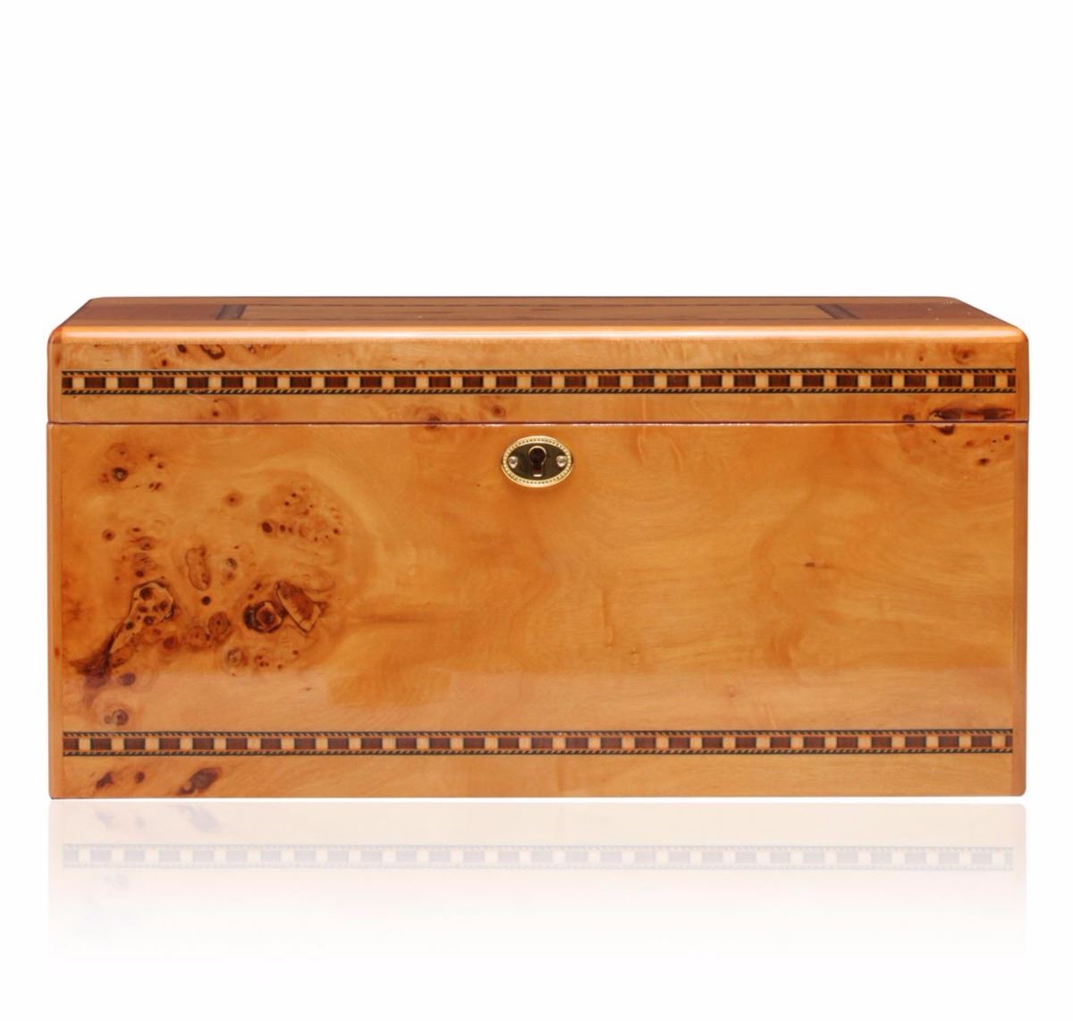 One deluxe cigar humidor featuring a glossy light wood exterior lined with premium Spanish cedar and solid brass hardware. Beautifully handcrafted to provide your cigars with the perfect environment for storage. This deluxe humidor will surely enhance your cigars smell and taste. Includes: Humidor, Hygrometer, Humidification System, Accessories, Instructions Manual. Measures 13 x 6.5 x 9.5 inches.
