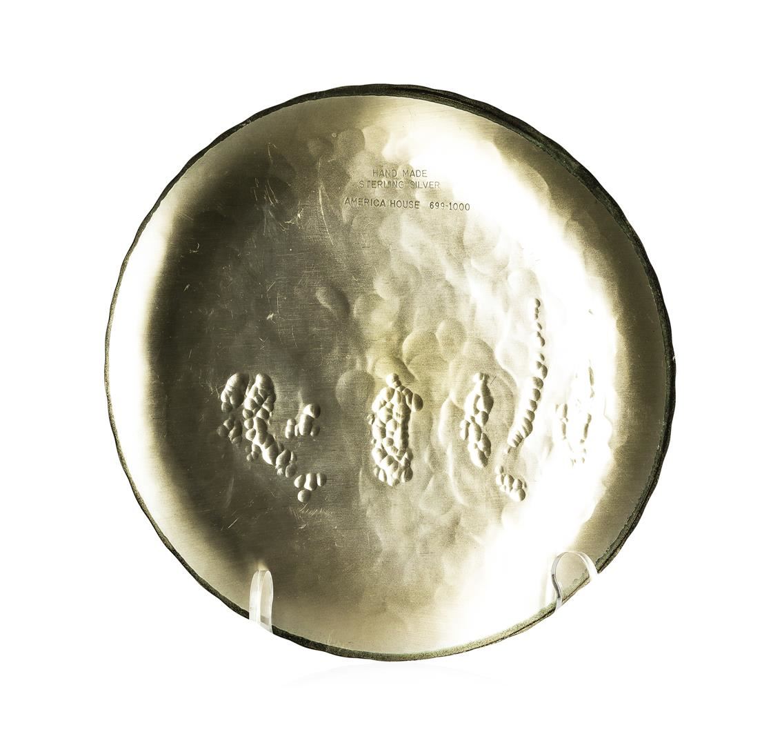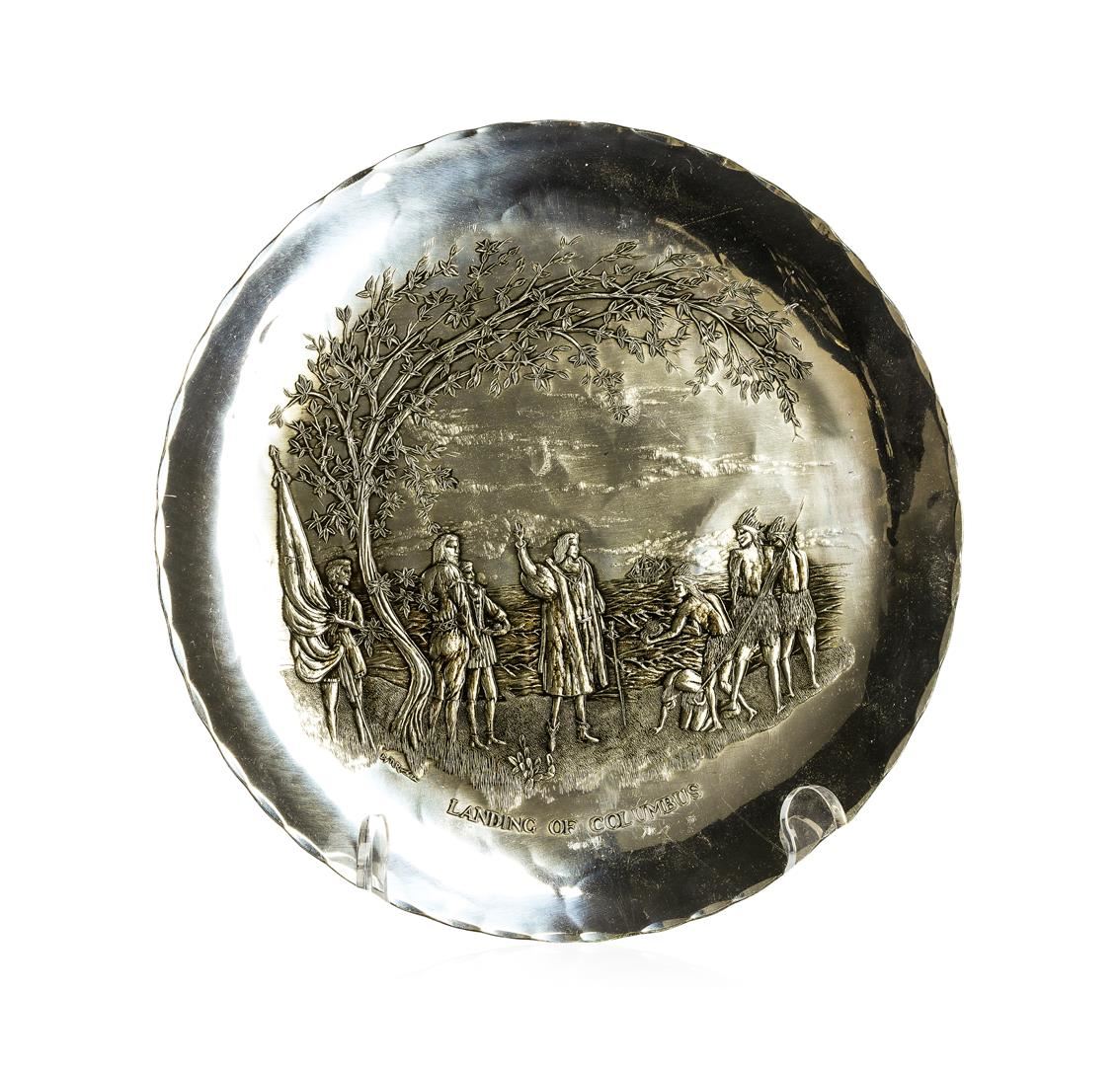One sterling silver limited edition 1972 Landing of Columbus plate by America house. Numbered #699/1,000. Weighs 530 grams and measures 9" wide.