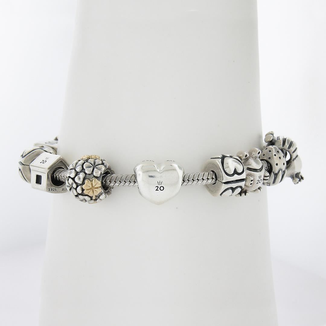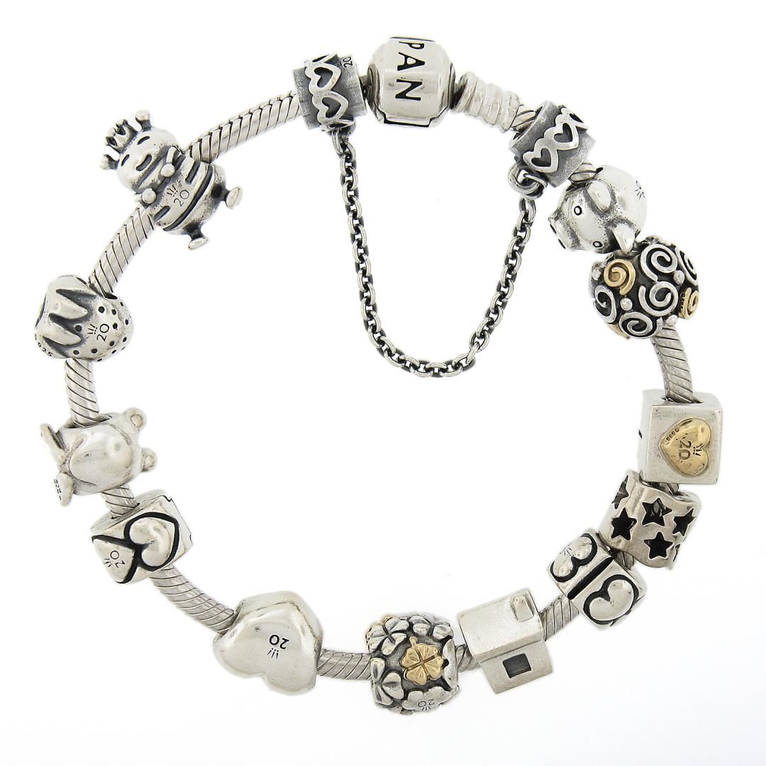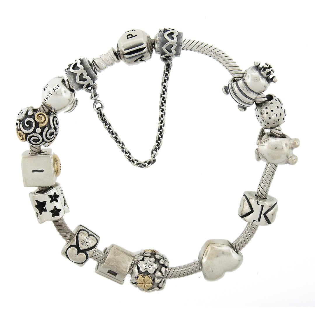 A silver with yellow gold accents moments chamr bracelet by pendora. It weighs a total of 58.5 grams, measures 11.2mm wide, and measures 7 inches in length.