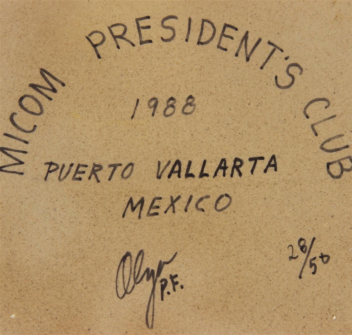 Limited Edition Mexican Hieroglyph Bowl by Olga Ponce Furginson 28/50. This limited edition bowl by artist Olga Ponce Furginson measures 9" x 4". Included with bowl is printed note from Olga explaining the hieroglyph motif and how the pot was made.