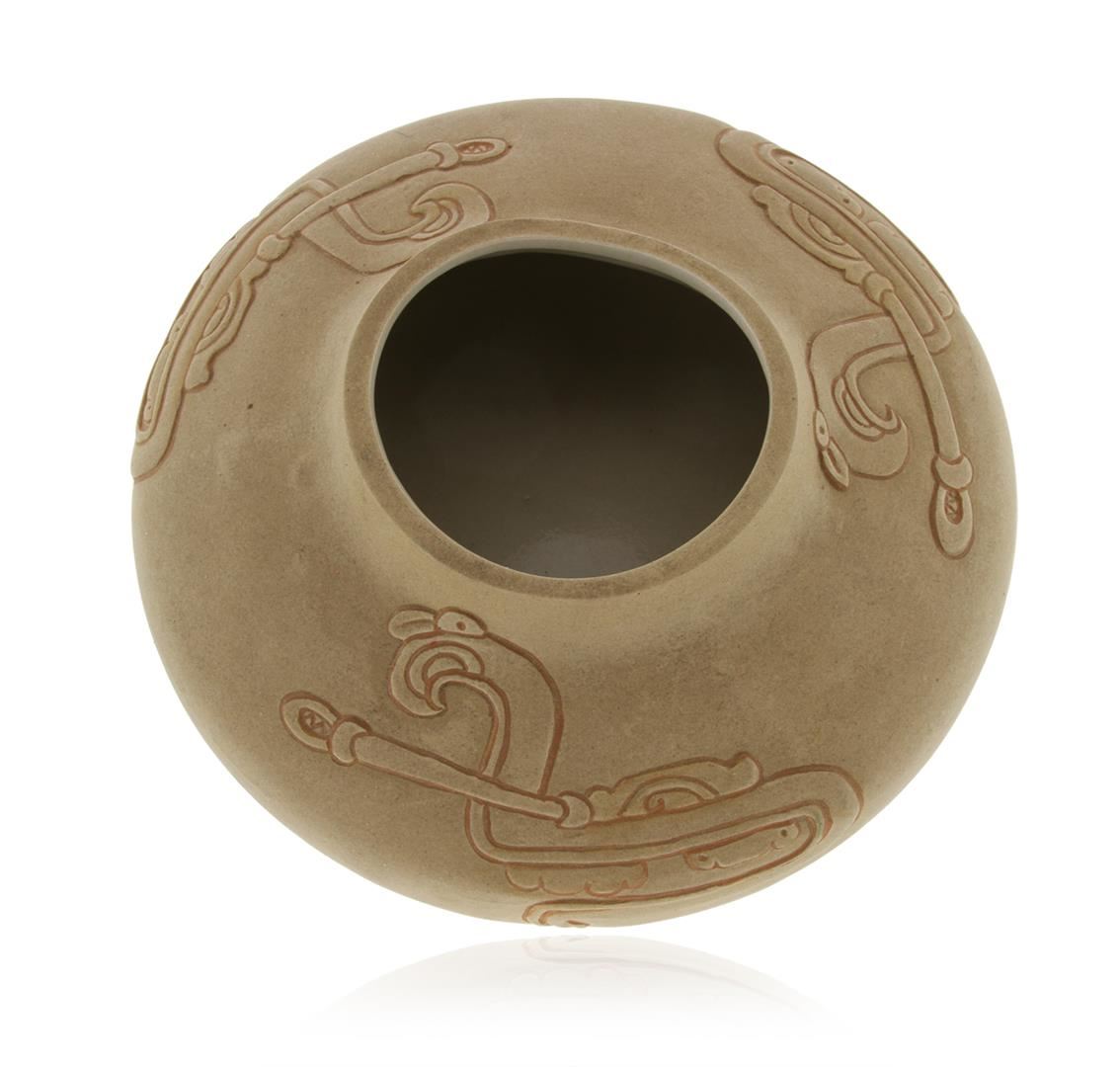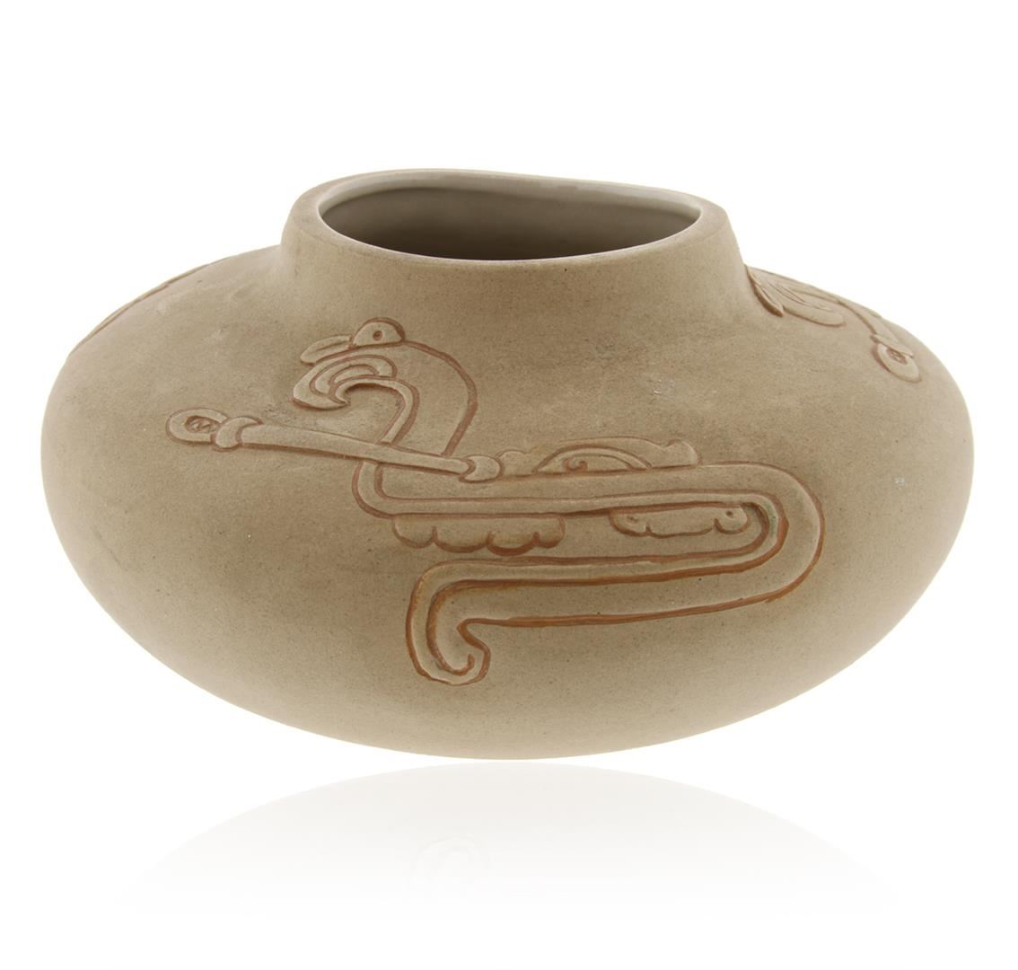 Limited Edition Mexican Hieroglyph Bowl by Olga Ponce Furginson 28/50. This limited edition bowl by artist Olga Ponce Furginson measures 9" x 4". Included with bowl is printed note from Olga explaining the hieroglyph motif and how the pot was made.
