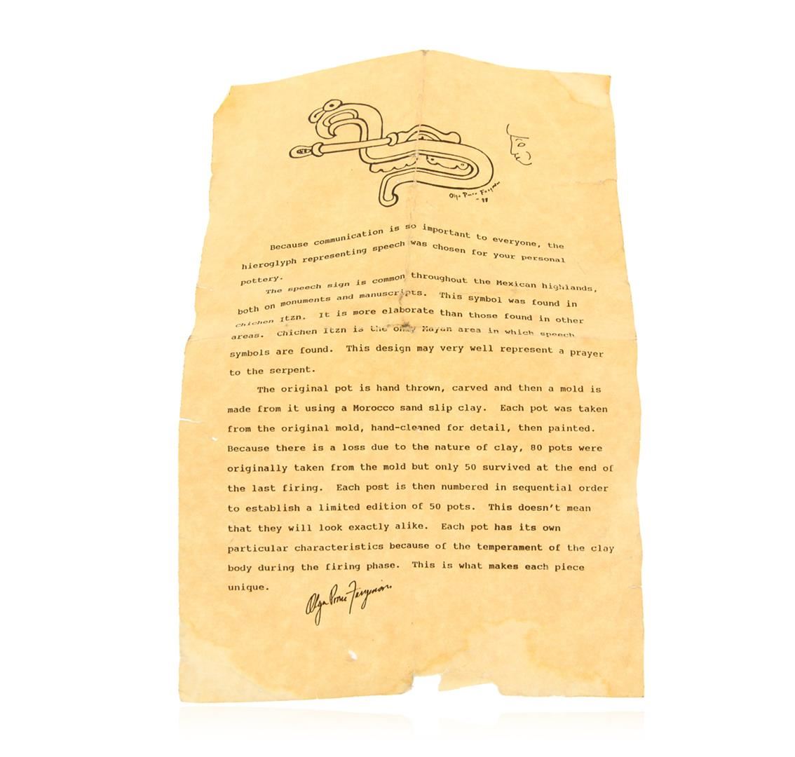 Limited Edition Mexican Hieroglyph Bowl by Olga Ponce Furginson 28/50. This limited edition bowl by artist Olga Ponce Furginson measures 9" x 4". Included with bowl is printed note from Olga explaining the hieroglyph motif and how the pot was made.