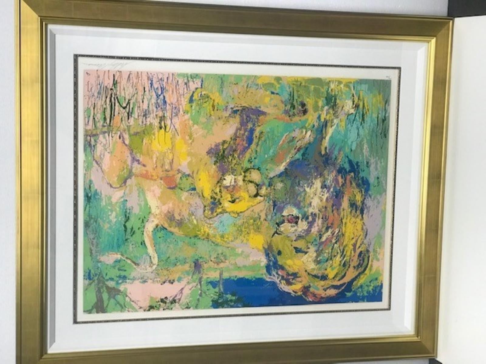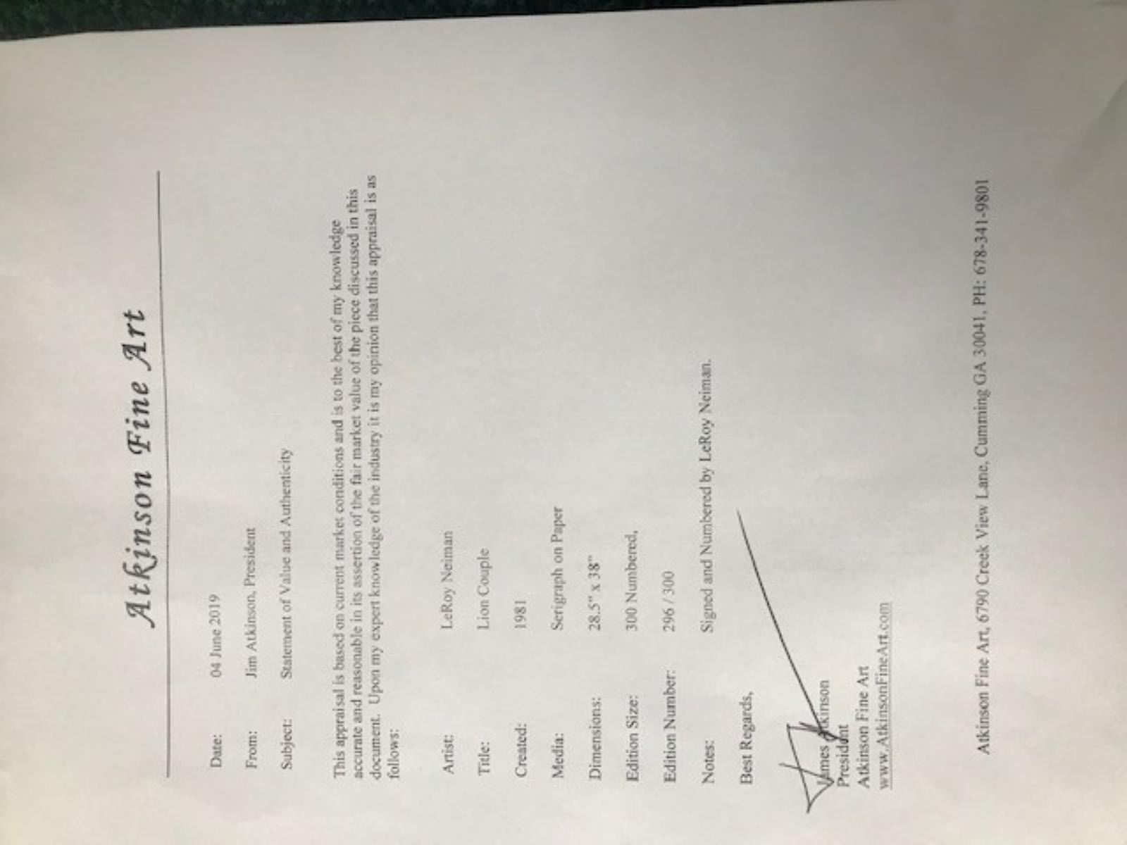 "Lion Couple" by LeRoy Neiman (1921-2012) - Hand signed limited edition serigraph #296 of 300 - Includes Certificate of Authenticity - Framed size = 54" wide x 44" tall