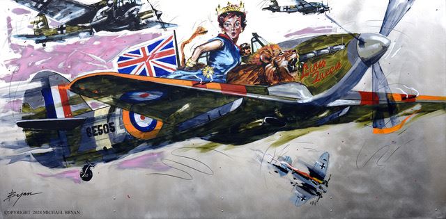 A Unique hand-embellished giclee on canvas featuring a WWII fighter jet by Michael Bryan. It is 20x40" numbered 1/1 w/COA from Artist.