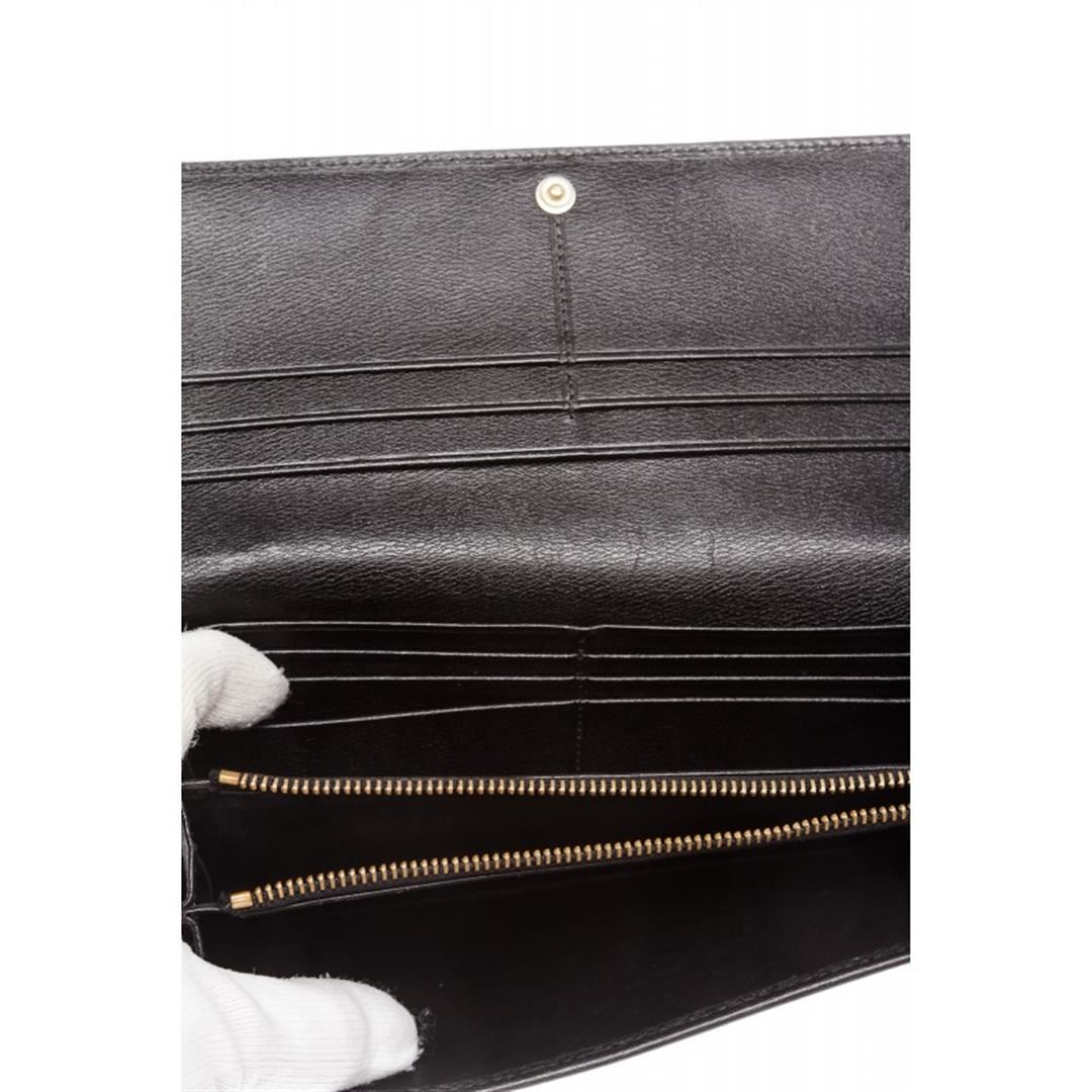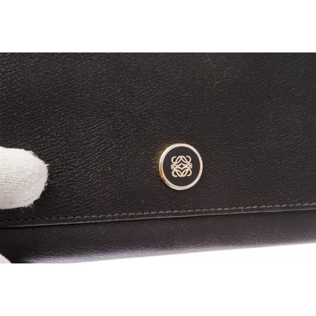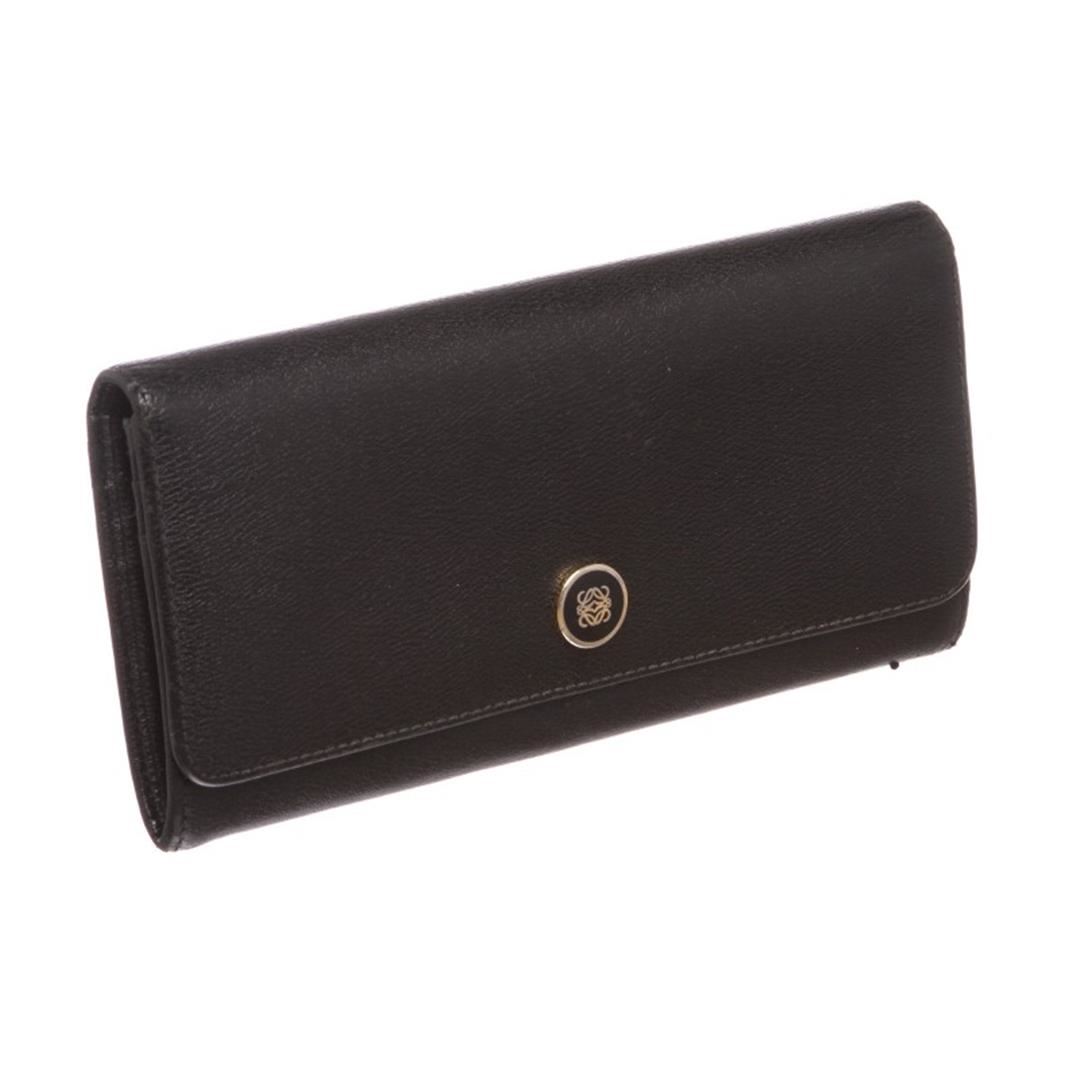One Loewe Black Leather Long Wallet. Overall flap snap closure with embellishment. Interior is leather and fabric lined and contains two compartments with zipper pocket partition, multiple credit cardip pockets and four billfold pockets. Exterior contains back zipper pocket. Item is pre-owned.