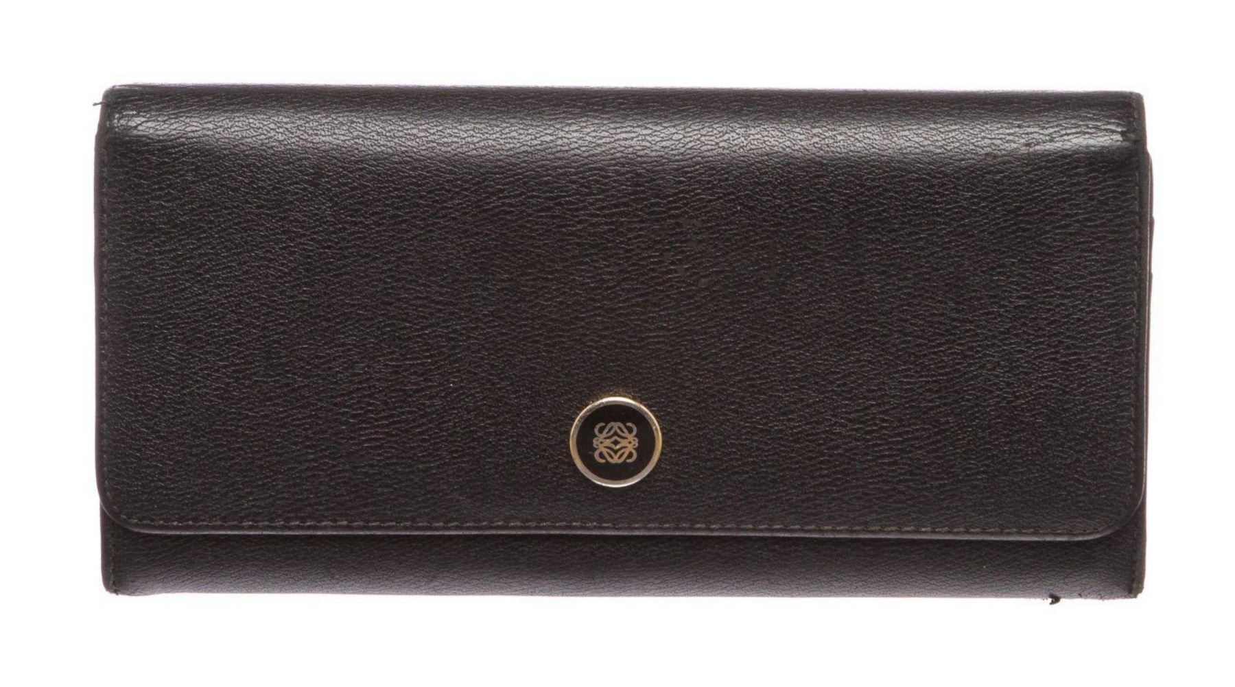 Overall flap snap closure with embellishment. Interior is leather and fabric lined and contains two compartments with zipper pocket partition, multiple credit card slip pockets and four billfold pockets. Exterior contains back zipper pocket. Measurements: Length: 7.5 in / 19 cm Width: 75 in / 191 cm 3.5 in / 9 cmCONDITION: Pre-Owned Good overall, please see photographs for detail.