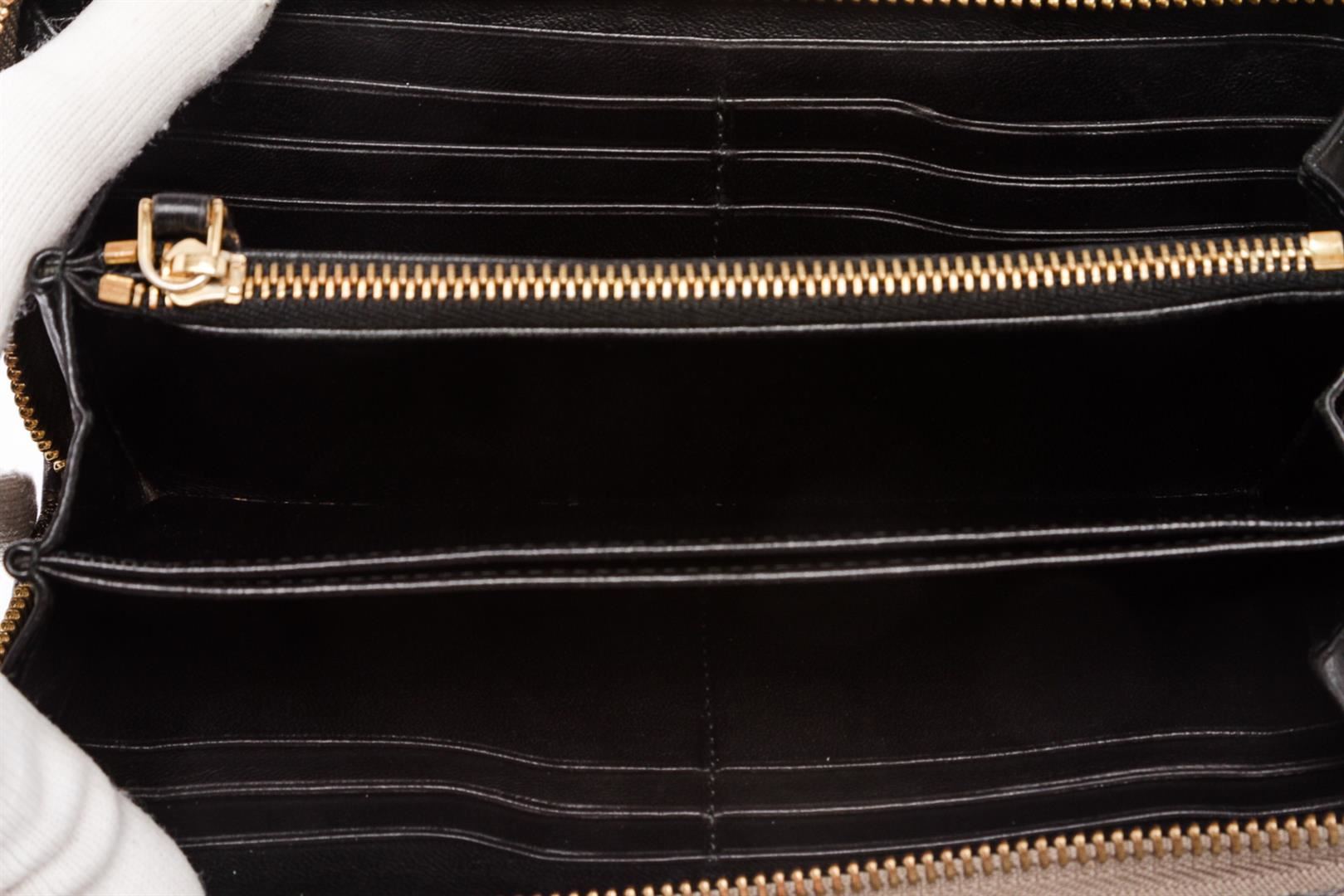 Overall zip-around closure. Interior is leather lined and contains three compartments one zipper pocket partition. Interior also includes twelve credit card slip pockets and three billfold slip pockets. Exterior contains gold-tone hardware and embossed logo at front.