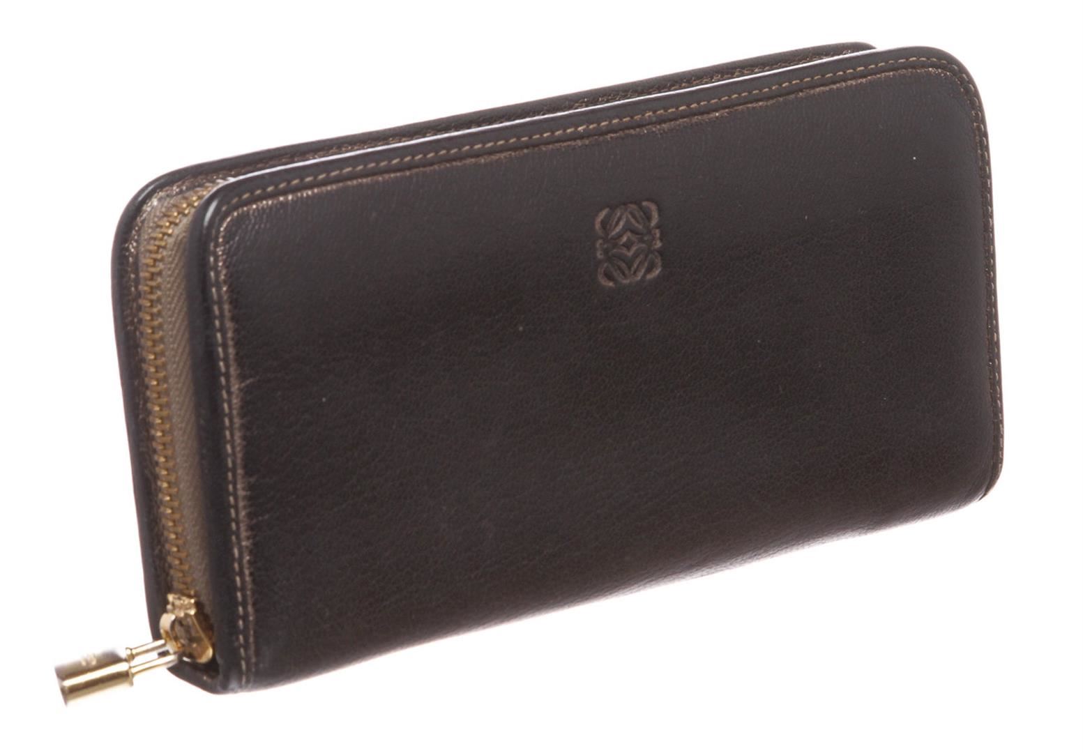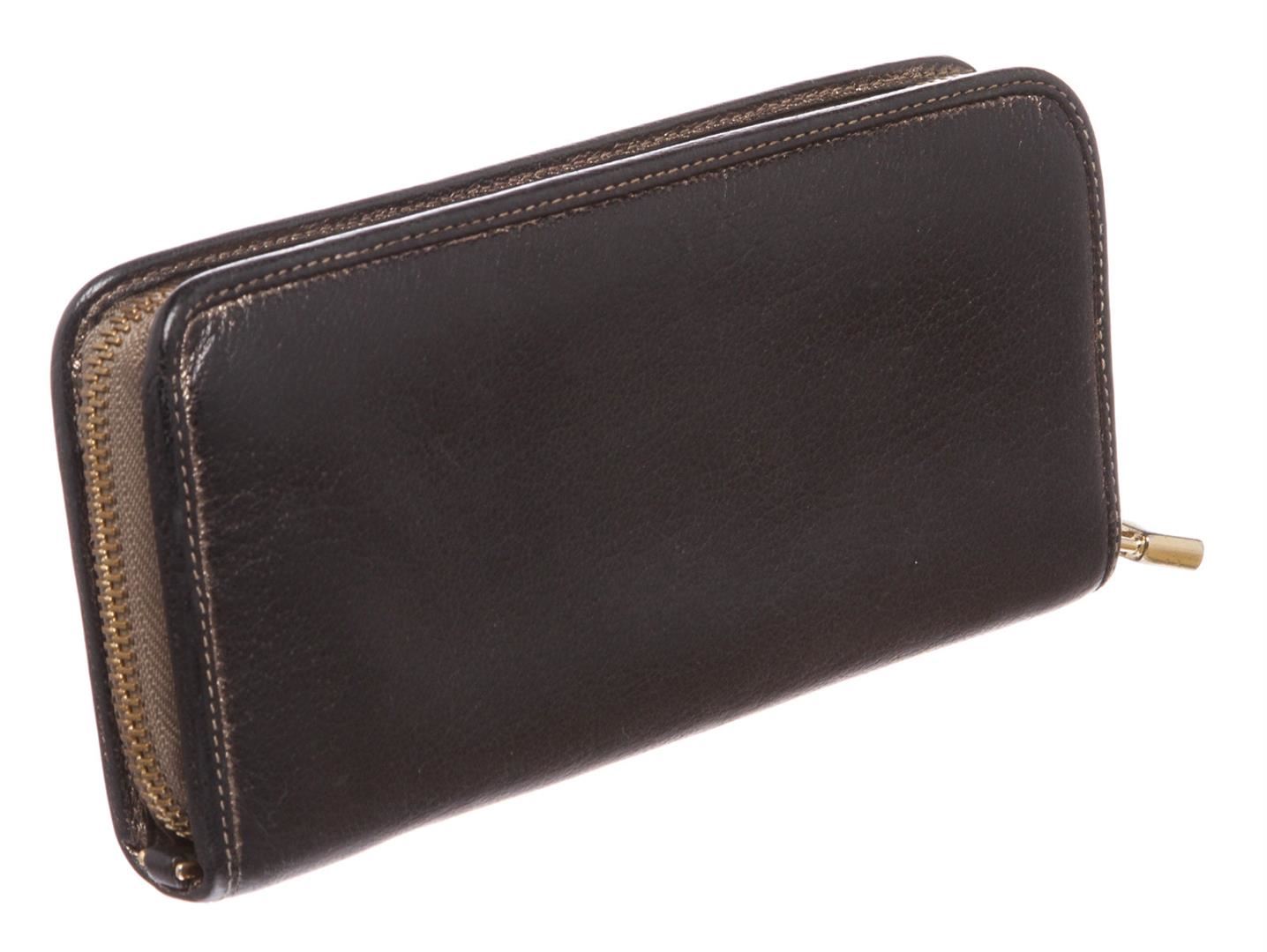 Overall zip-around closure. Interior is leather lined and contains three compartments one zipper pocket partition. Interior also includes twelve credit card slip pockets and three billfold slip pockets. Exterior contains gold-tone hardware and embossed lo