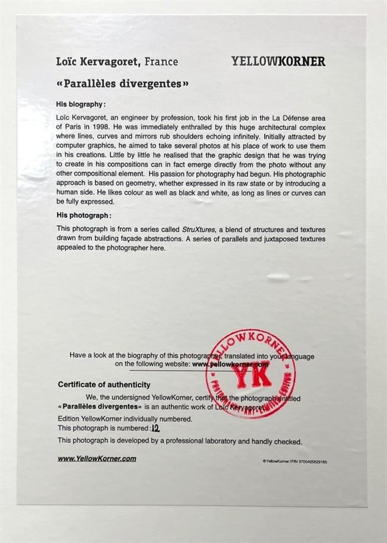 Loic Kervagoret France Paralleles Divergentes YellowKorner Certified Photograph. Certificate of Authenticity from YellowKorner affixed to the back. Matted Dimensions 16"x20". Protected with Clear Mylar Sleeve.