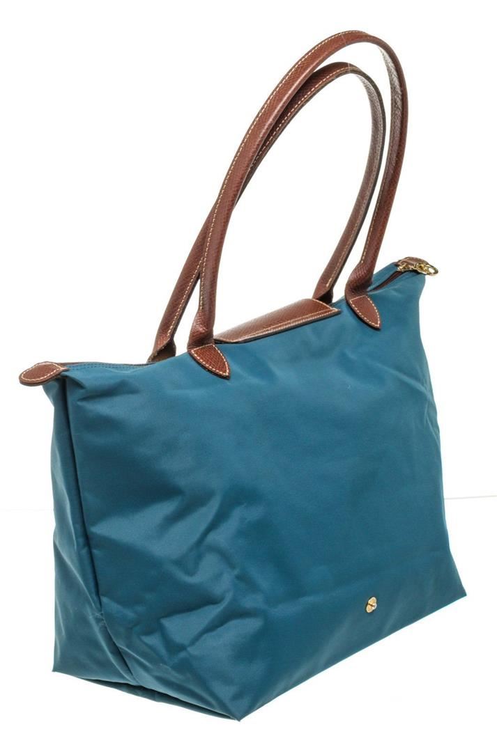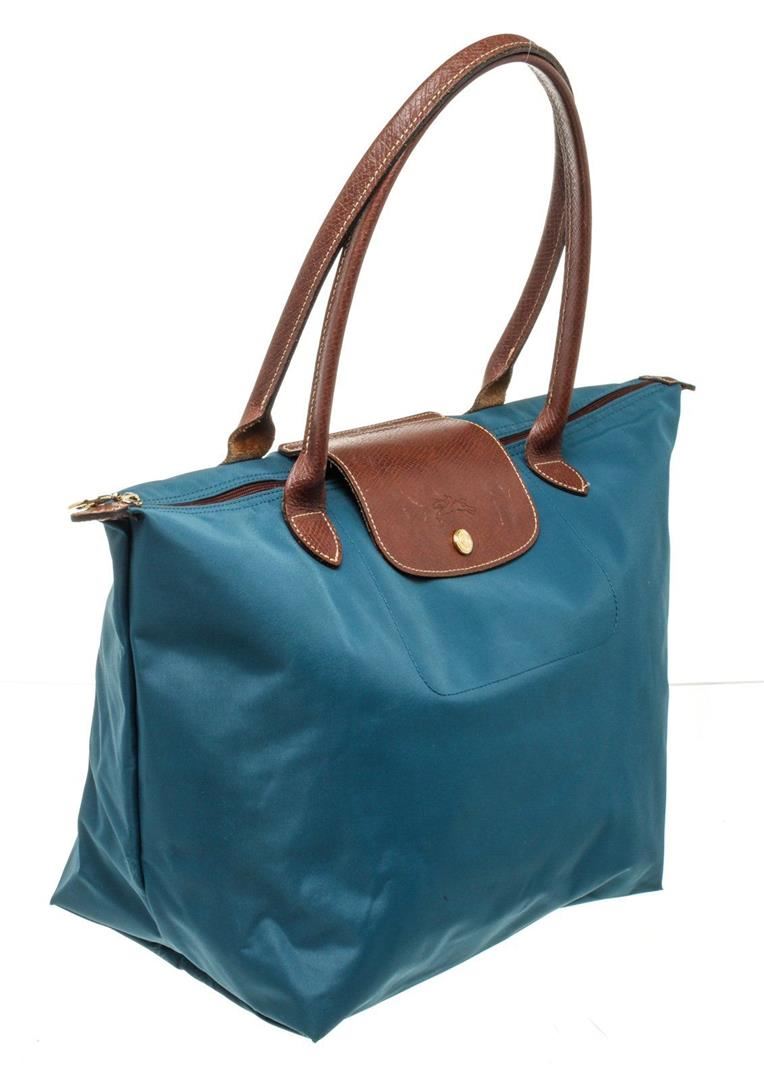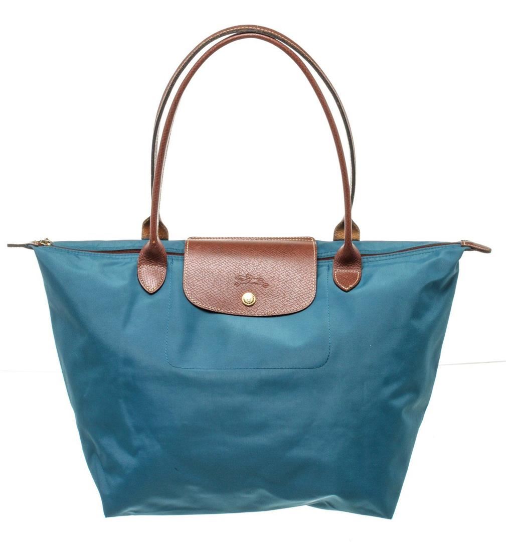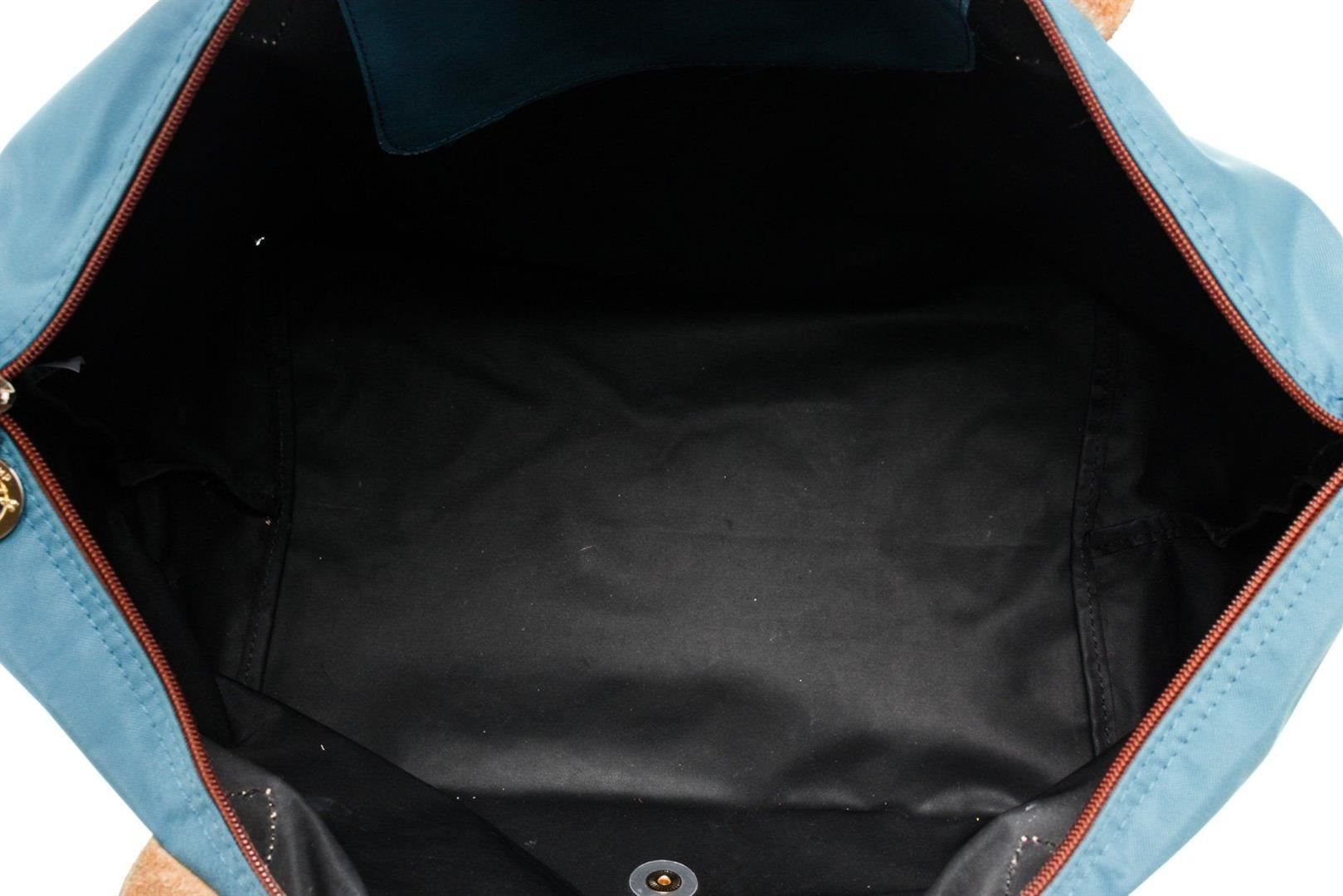 Longchamp Blue Brown Leather Shoulder Bag with gold-tone hardware, interior slip pockets, dual top handle and zipper closure.