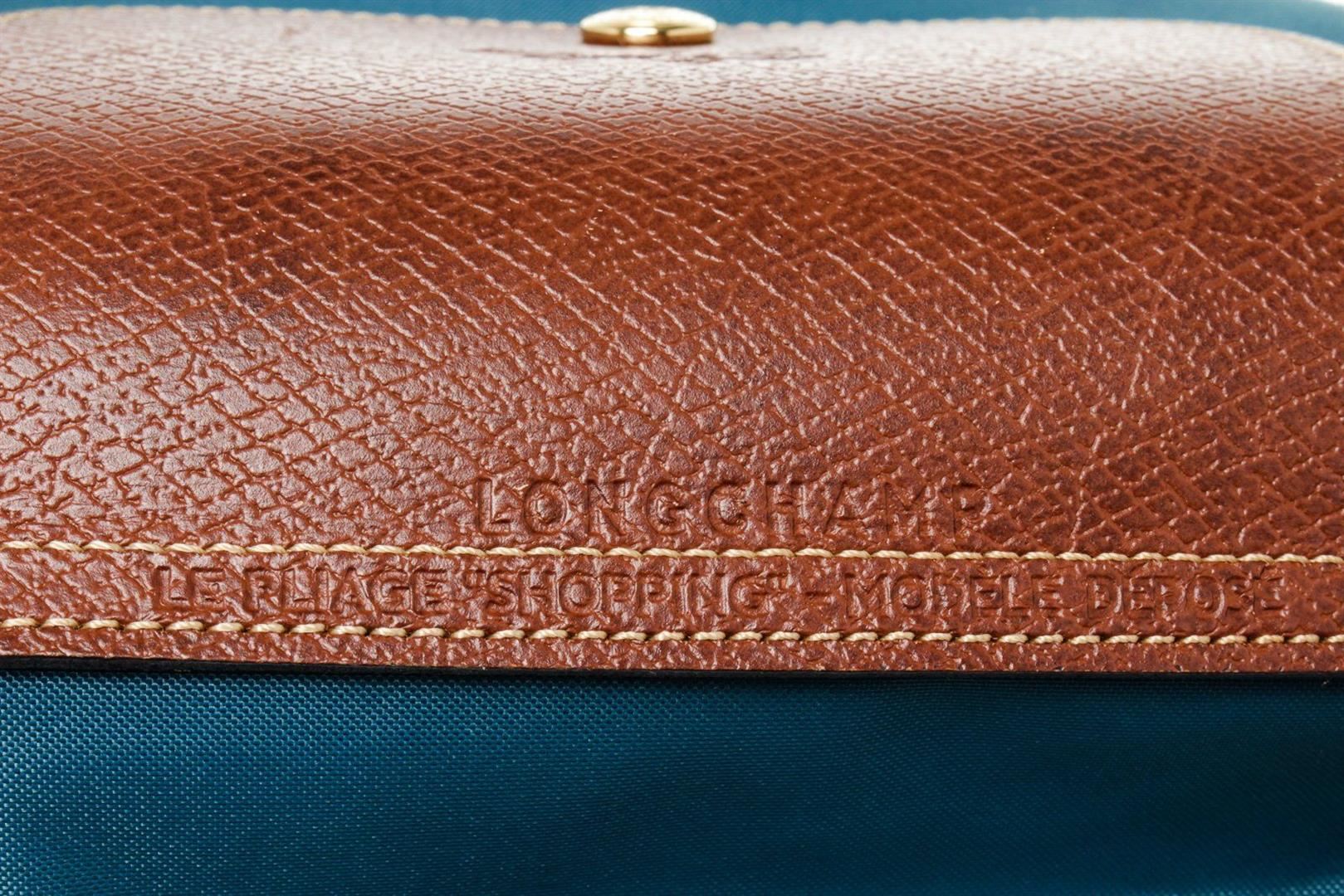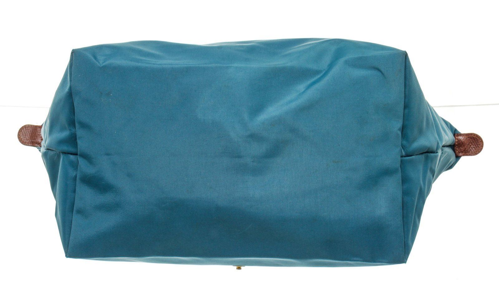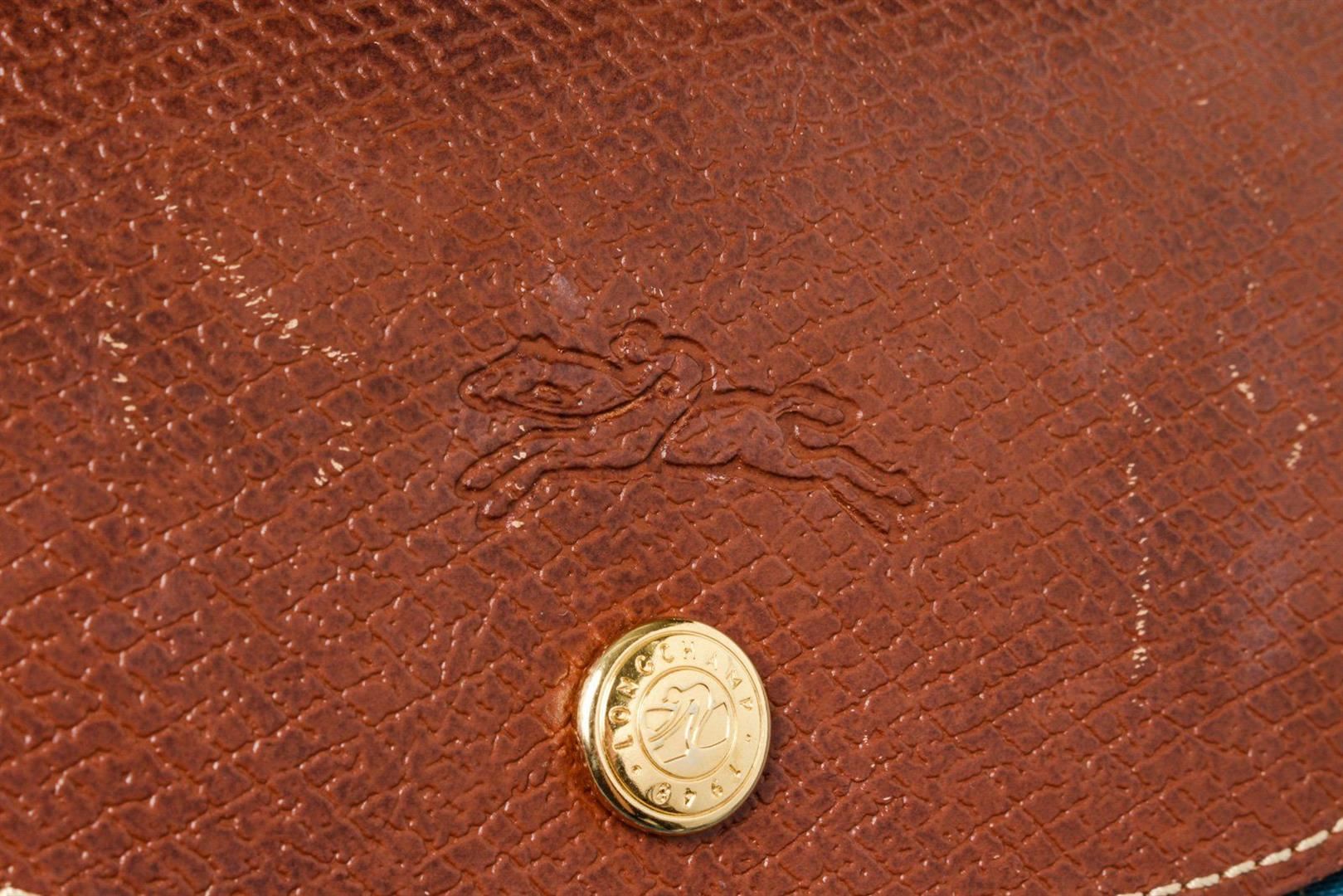 Longchamp Blue Brown Leather Shoulder Bag with gold-tone hardware, interior slip pockets, dual top handle and zipper closure.