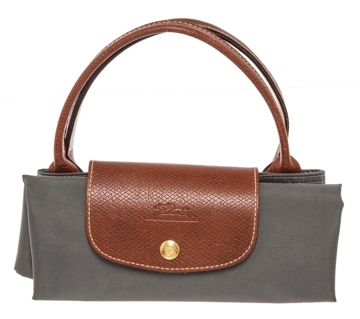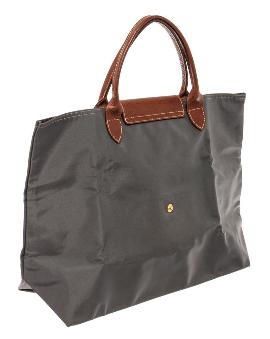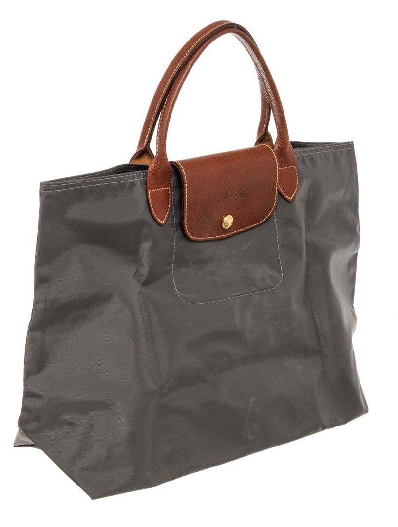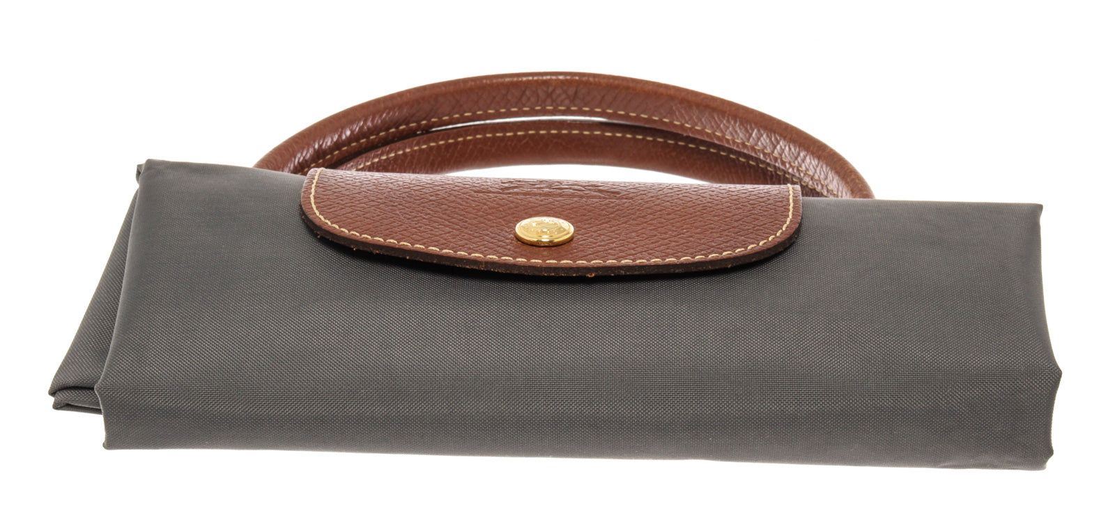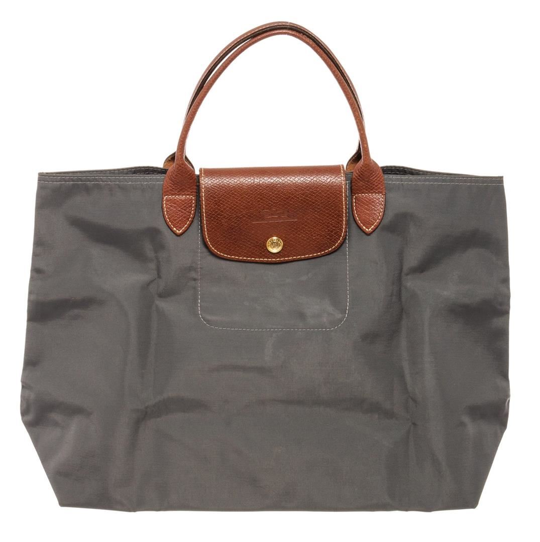 Longchamp Grey Nylon Le Pliage Medium no zipper tote bag with gold-tone hardware, fabric interior lining, one slip pocket at interior wall and double brown leather top handles.