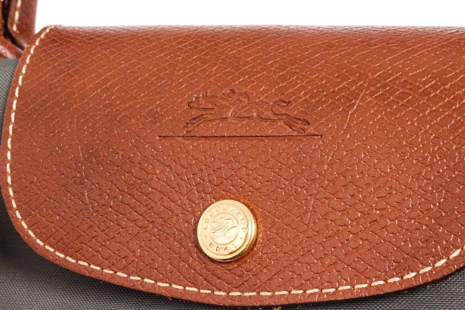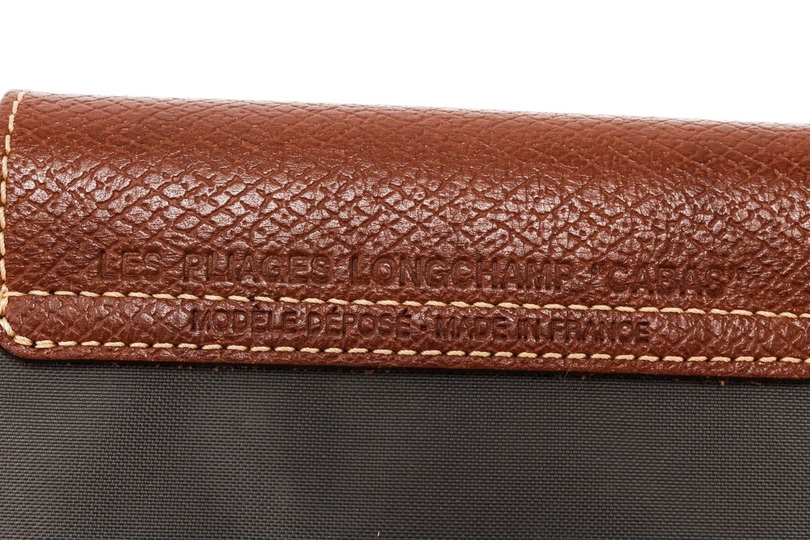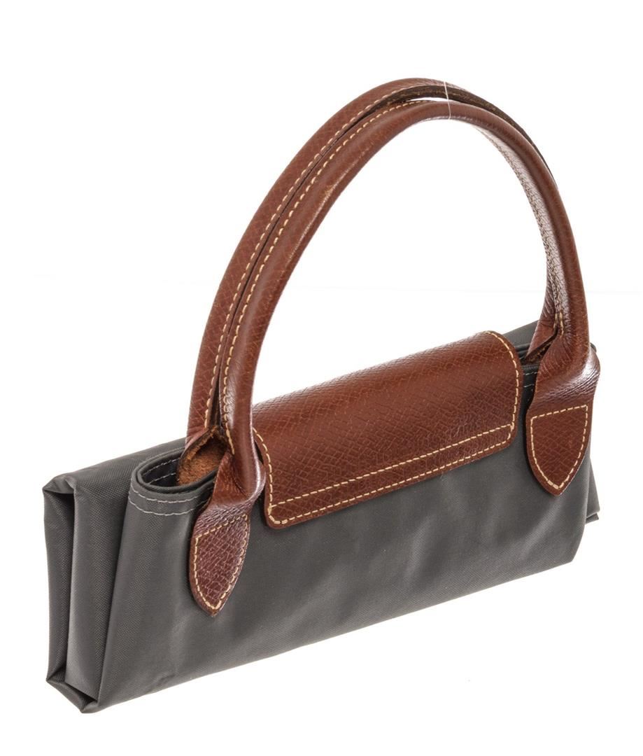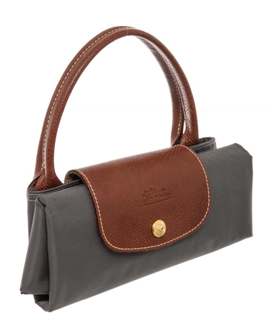 Longchamp Grey Nylon Le Pliage Medium no zipper tote bag with gold-tone hardware, fabric interior lining, one slip pocket at interior wall and double brown leather top handles.
