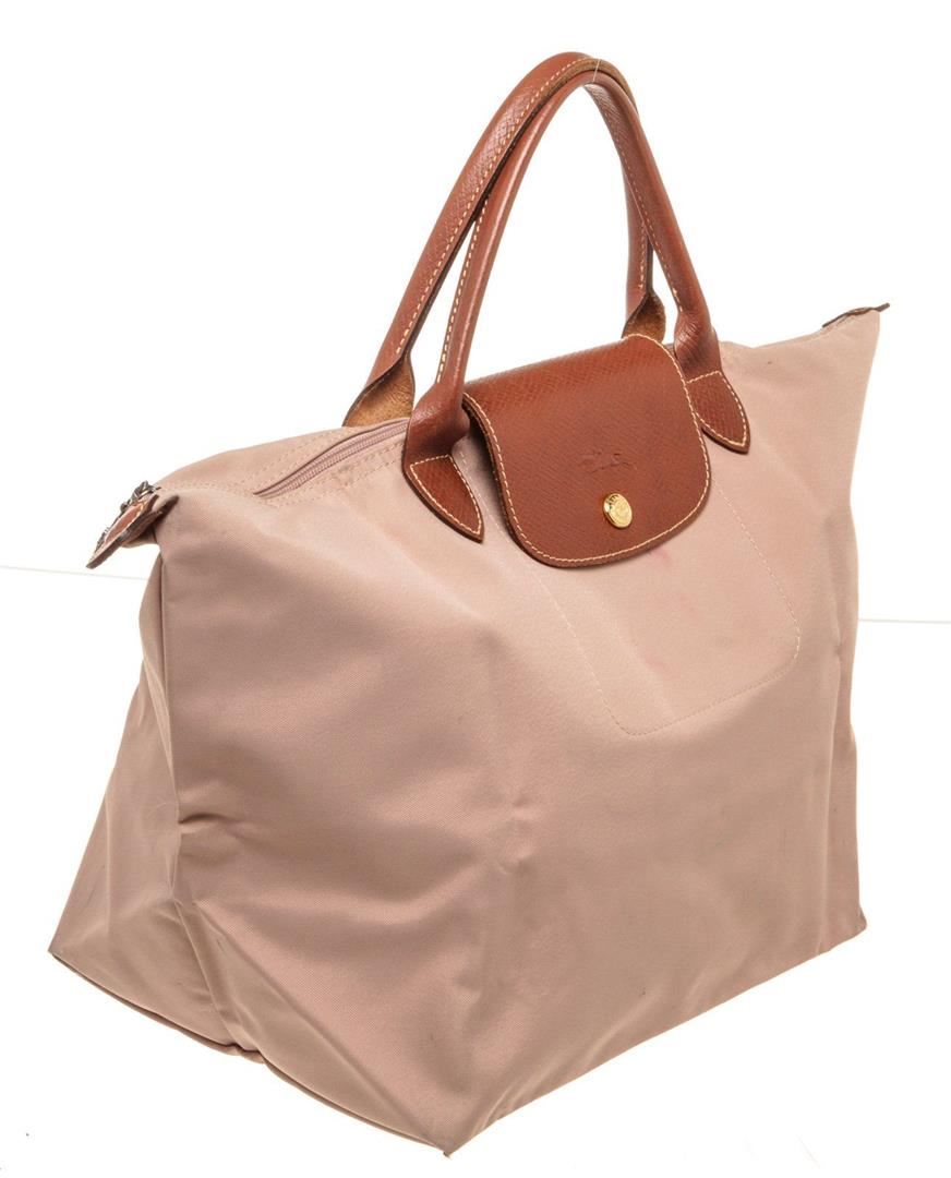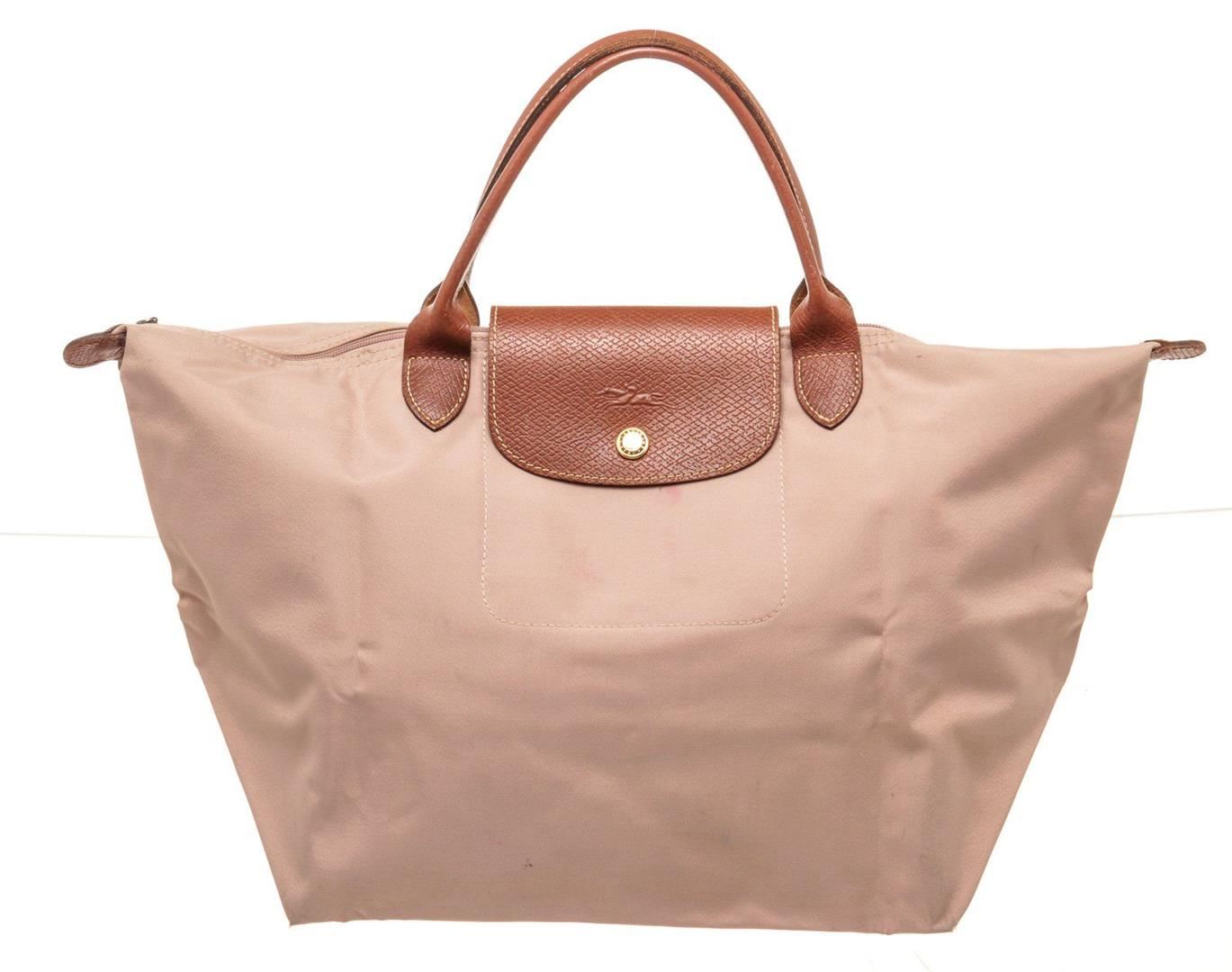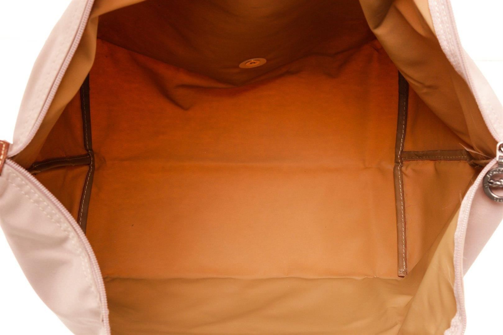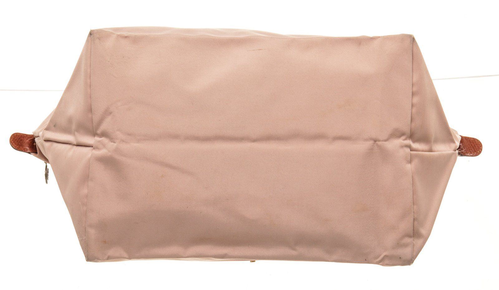 Longchamp Pink Canvas Convertible Shoulder Bag with silver-tone hardware, burgundy logo fabric interior lining, one slip pocket at interior wall and overall zipper top closure.