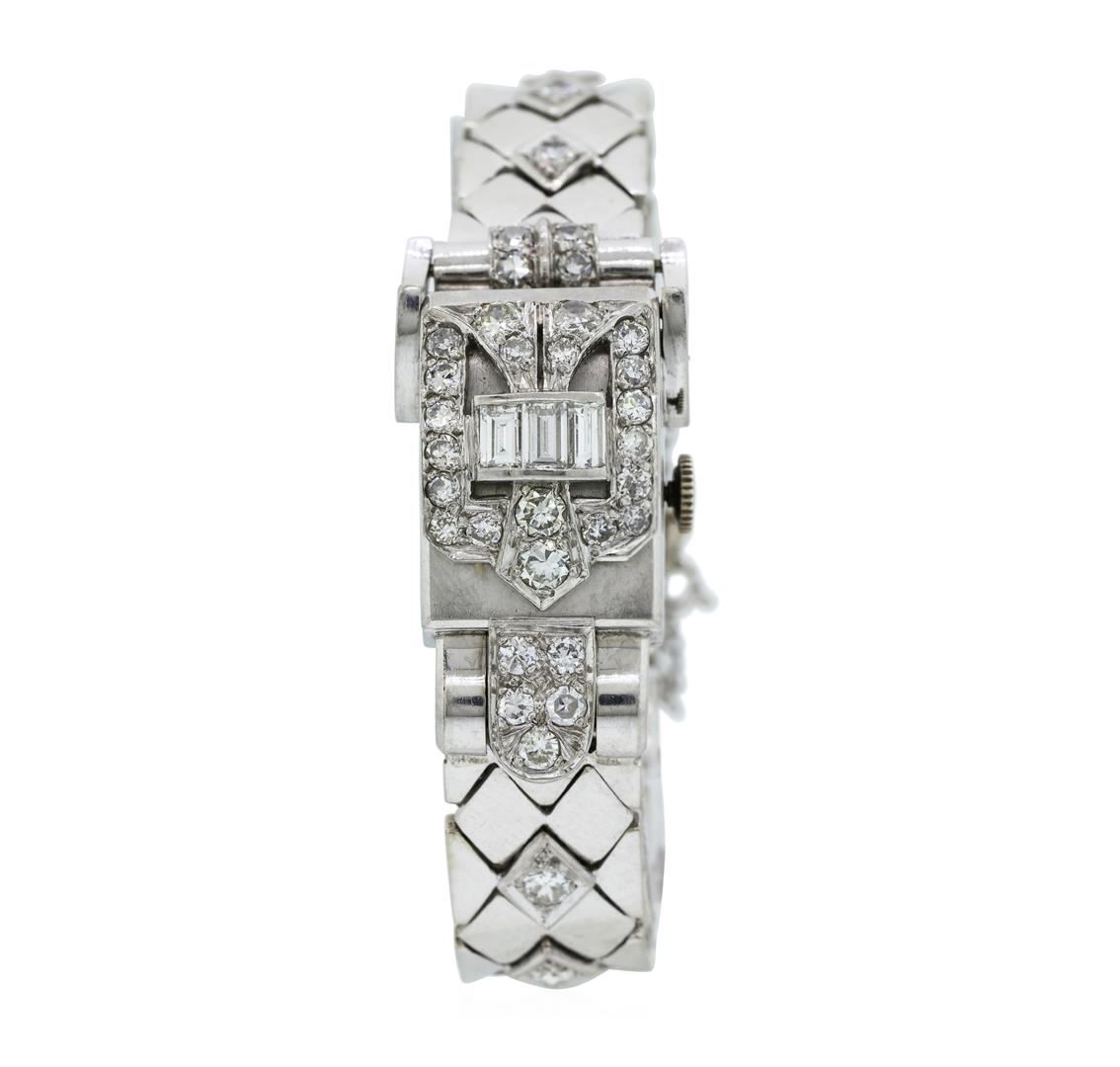 One lady's, hand fabricated Longines retangular shape case bracelet watch electronically tested platinum and 14KT white gold, Crown: pull-out, Crystal: flat glass, Movement: manual wind 17 jewel, Dial: silver satin with baton, pointed type hands and gold dot marker numerals, Bracelet: matching link style band, Condition: G-4 average. The featured wristwatch has a platinum case with an attached 14KT white gold strap. Containing: Four prong set round brilliant cut diamonds, measuring 3.20 - 2.90 x 1.89mm (depth est.) approximate total weight of 4 Stones = 0.40 ct. Graded in the setting. Color H - I Clarity SI-1 to SI-2 Cut Good Thirty-Seven prong set round brilliant cut diamonds, measuring 2.60 - 2.10 x 1.46mm (depth est.) approximate total weight of 37 Stones = 1.80 ct. Graded in the setting. Color H - J Clarity SI-1 to I-1 Cut Good Three channel set baguette cut diamonds, measuring from 4.00 x 2.50 x 2.13mm (depth est.) to 4.10 x 2.70 x 2.30mm (depth est.) approximate total weight of 3 Stones = 0.64ct. Graded in the setting. Color G - H Clarity VS-1 to VS-2 Cut Very Good. Total Weight of Diamonds 2.84ct.. Total Weight of Watch 54.90gm GAS Appraised at $9090.00. GAS Appraised.