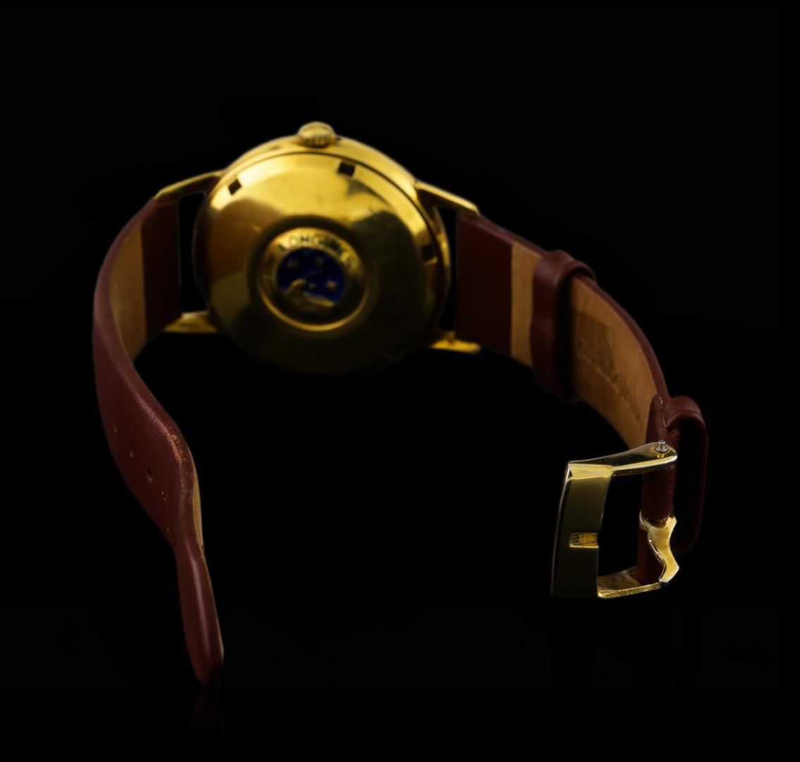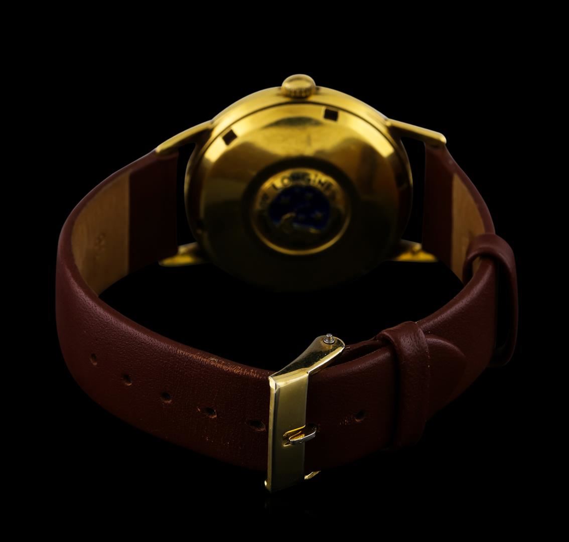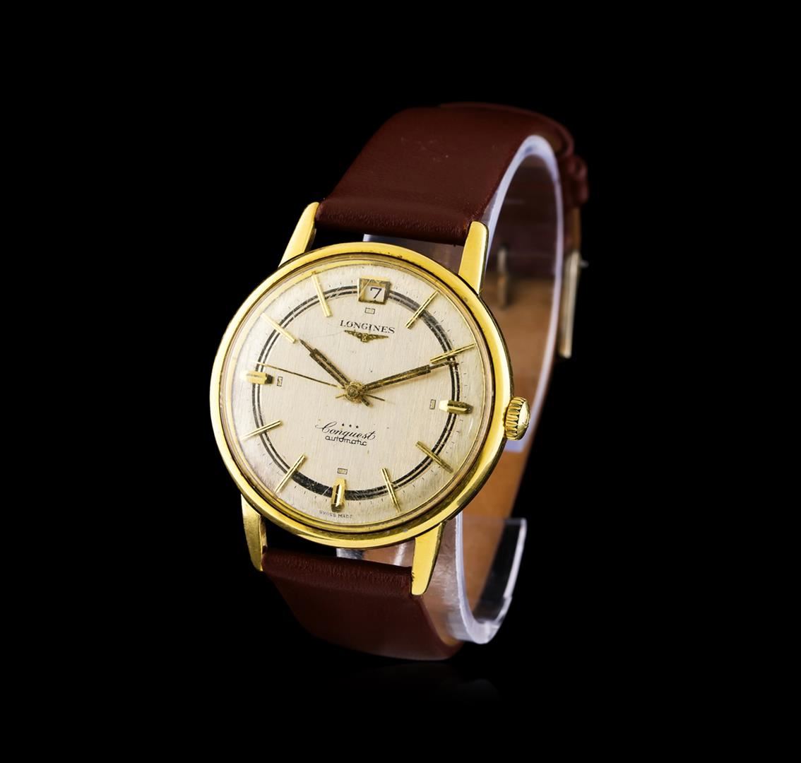 One Longines Conquest watch featuring: Movement: Automatic. Case: Yellow gold. Case Shape: Round. Bezel: Yellow gold. Dial: Silver color; gold tone hands; gold tone hour markers. Features: Date window located at the 12 o'clock position. Bracelet: Genuine brown leather strap with yellow gold buckle. Condition: Slightly noticeable surface scratches on case and crystal, but otherwise the watch is in good condition.