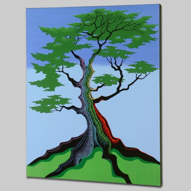 Larissa Holt, a student of distinguished artist Eyvind Earle (1916-2000), uses bold colors and breathtaking scenery to create images of Nature in her own unique style. "Lord of the Hills" is a limited edition giclee on stretched canvas by Holt, numbered and bearing Holt's authorized signature. This piece comes gallery wrapped. Includes Certificate of Authenticity! Measures approx. 21.5" x 27" x 1.5" (image).
