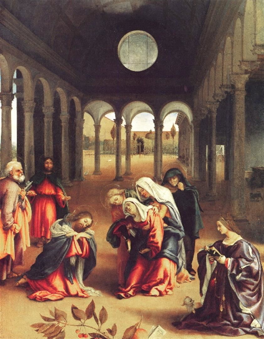 Artist: Lorenzo Lotto - Title: Christ Bids Farewell to His Mother - Medium: Fine Art Giclee on Canvas - Image Size: Approximately 32 inches x 25 inches - Unframed on Unstretched Canvas - Biography: Lorenzo Lotto (c. 1480 - 1556/57) was an Italian painter, draughtsman and illustrator, traditionally placed in the Venetian school, though much of his career was spent in other north Italian cities. He painted mainly altarpieces, religious subjects and portraits. He was active during the High Renaissance and the first half of the Mannerist period, but his work maintained a generally similar High Renaissance style throughout his career, although his nervous and eccentric posings and distortions represented a transitional stage to the Florentine and Roman Mannerists.