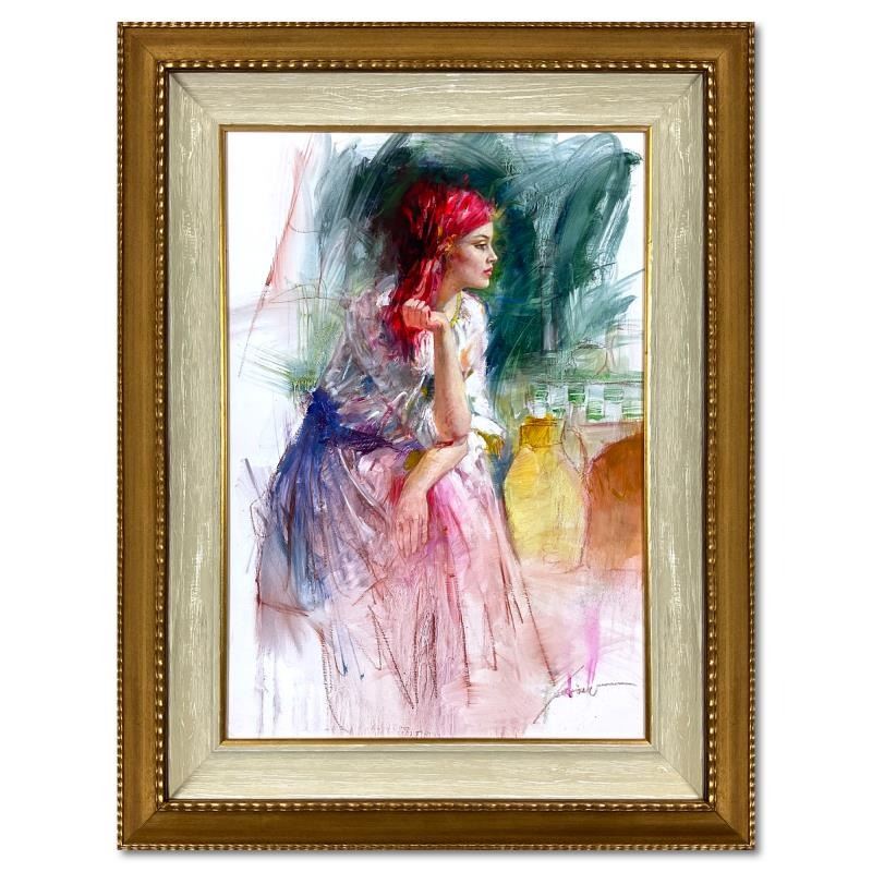"Lost in Thought" is an original oil painting on board by Pino (1939-2010), hand signed by the artist. This piece comes custom framed. Includes Letter of Authenticity. Measures approx. 29.5" x 38" (frame), 19" x 28" (image).