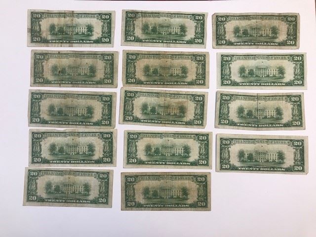 One Lot (14) 1929 $20 San Francsico CA National Currency Notes - Charter 13044.