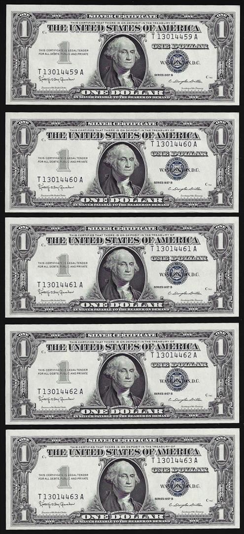 One Lot of (5) Consecutive 1957 $1 Silver Certificate Notes Uncirculated.