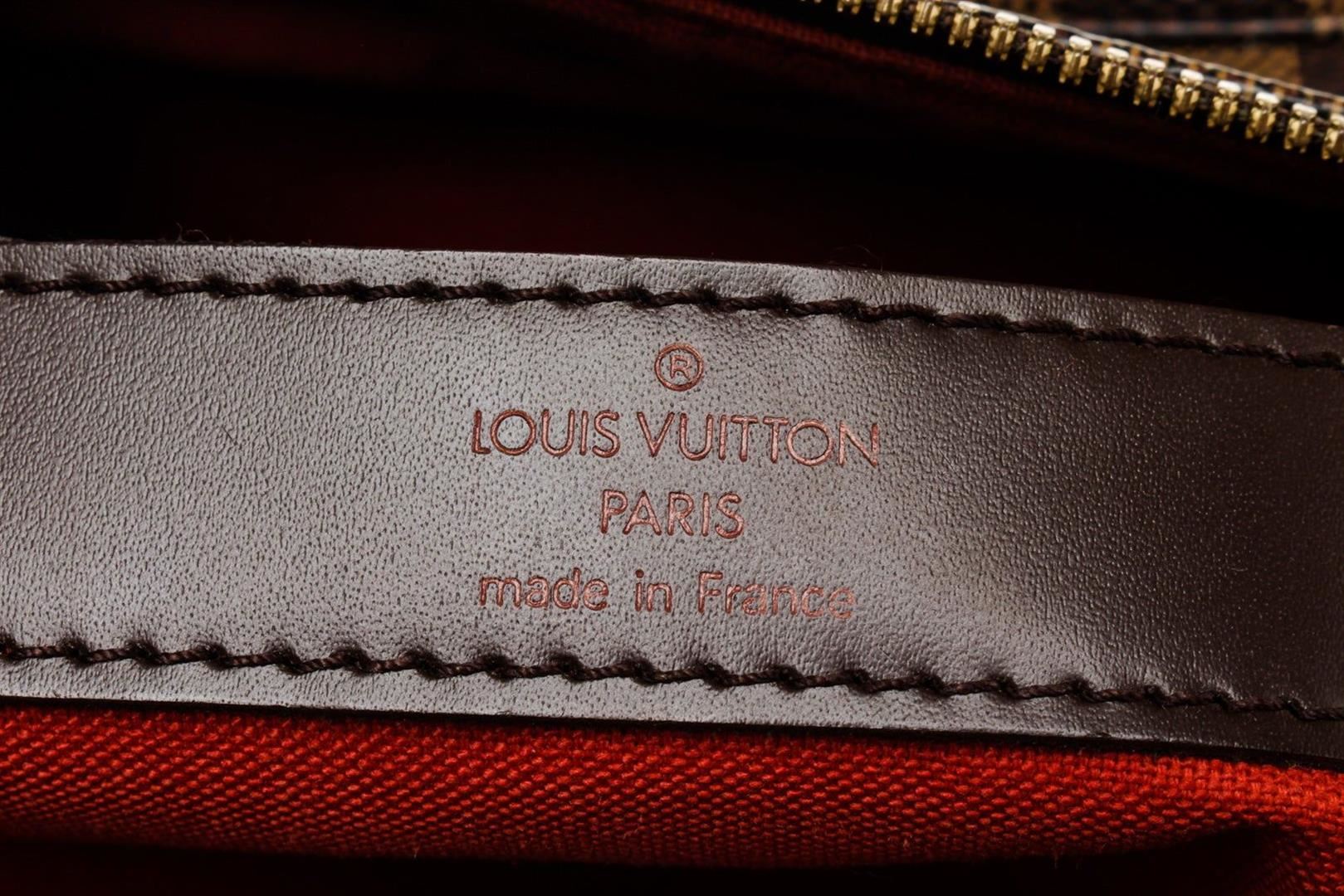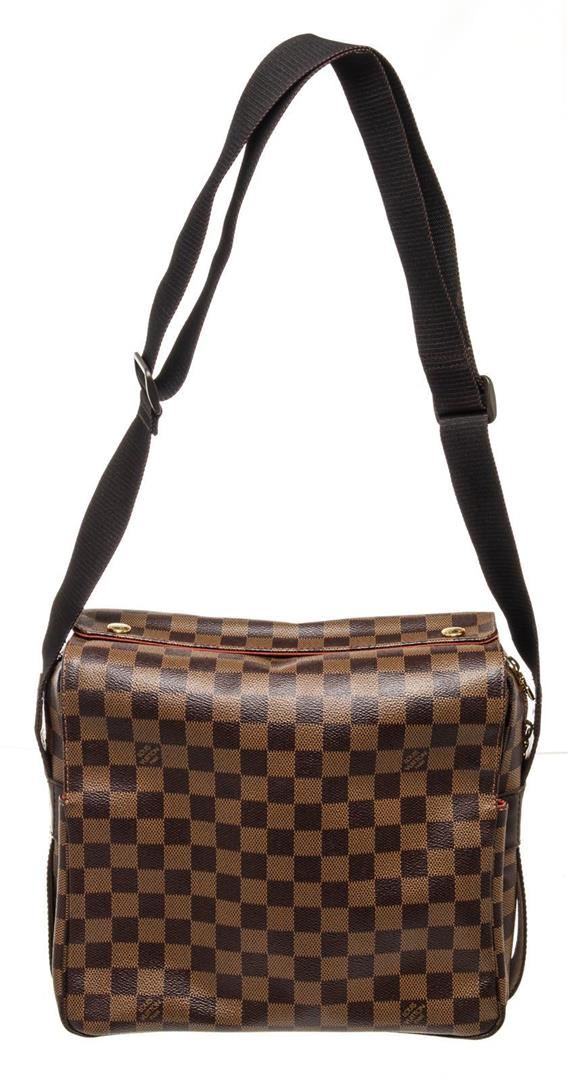 Louis Vuitto Brown Damier Naviglio Crossbody Bag with gold-tone hardware, trim tan vachetta leather, interior three compartments pocket, adjustable shoulder strap and zipper closure.
