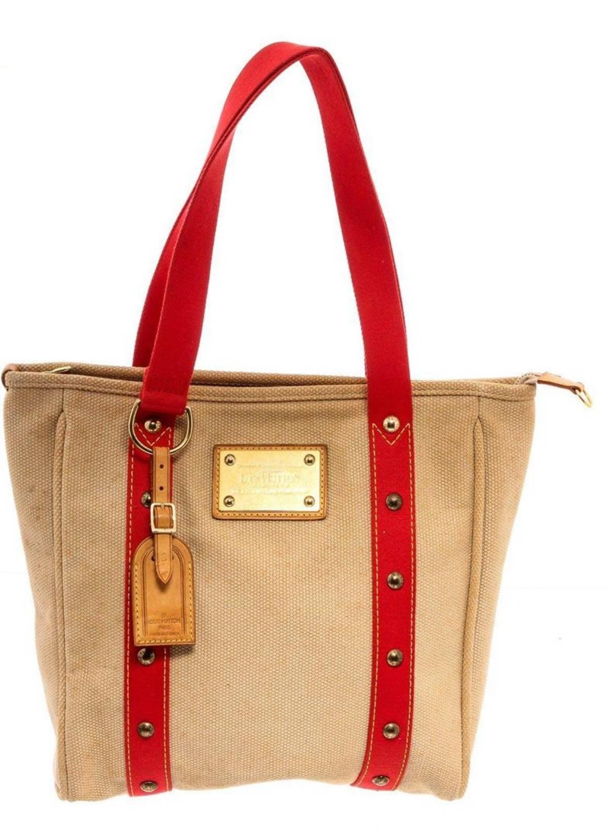 Beige Canvas Louis Vuitton Antigua Cabas MM tote with gold-tone hardware, tan vachetta leather and round stud accents, stripe canvas lining, single interior slit pocket, dual flat shoulder straps, logo placecard on front and zip closure on top. Measurements: Length: 11.2 in / 28 cm Width: 12 in / 30 cm 3.8 in / 10 cmCONDITION: Pre-Owned Good overall, please see photographs for detail.