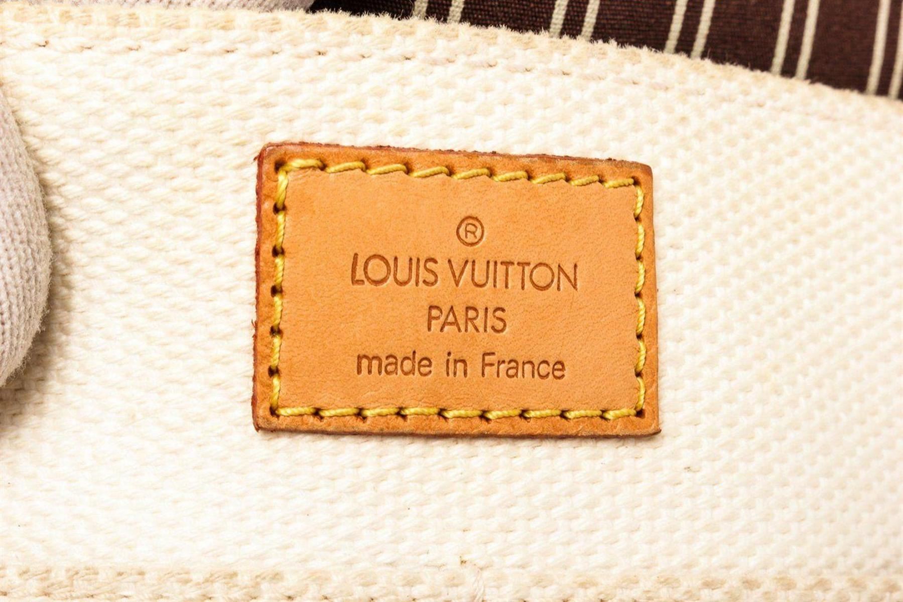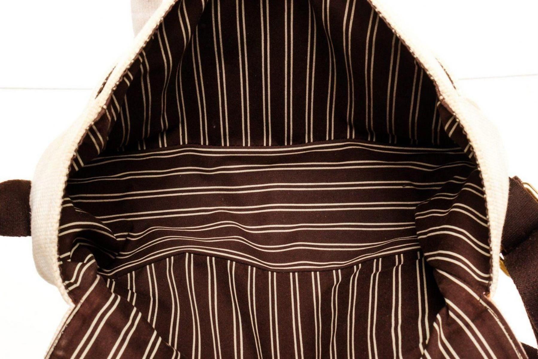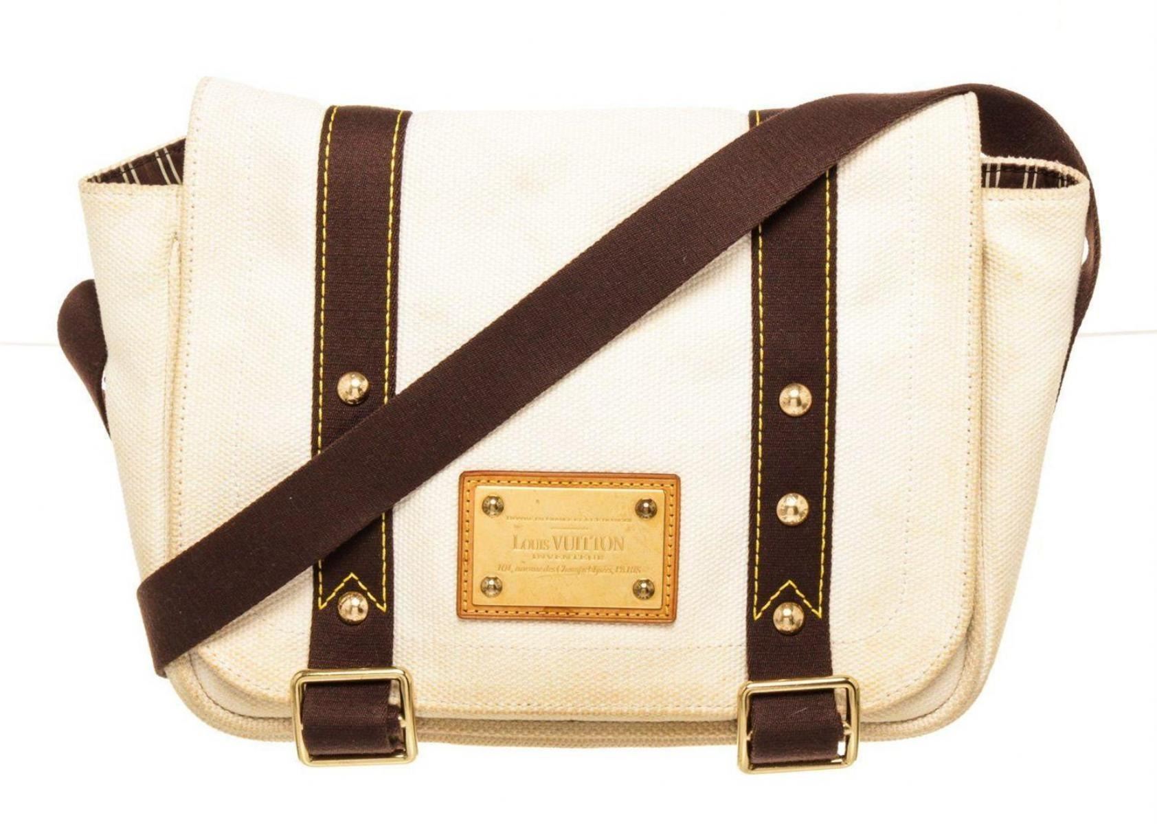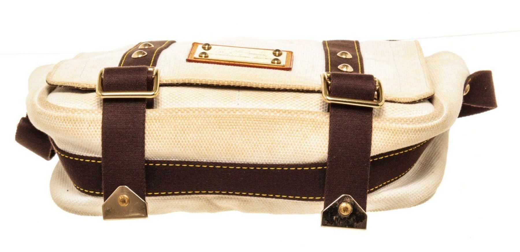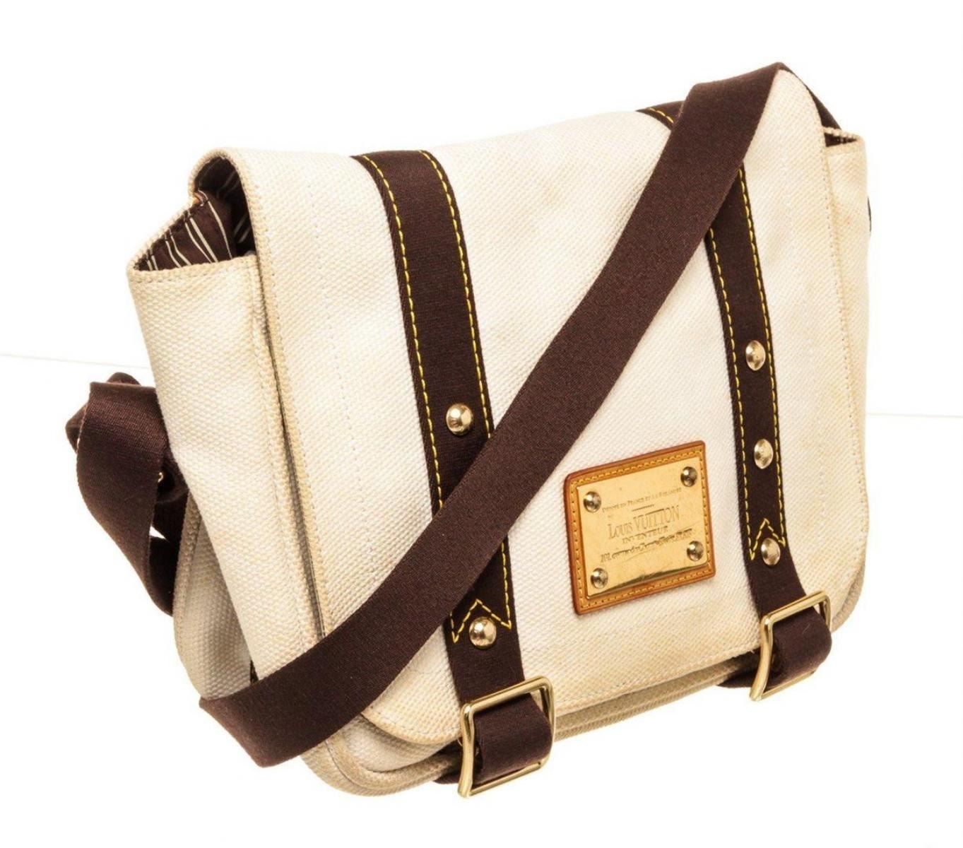 Louis Vuitton Beige Canvas Antigua Messenger Bag with brass hardware, single adjustable flat shoulder strap, logo placard at front flap, dual slip pockets under front flap, black and white striped woven interior lining and dual buckle closures at front flap.