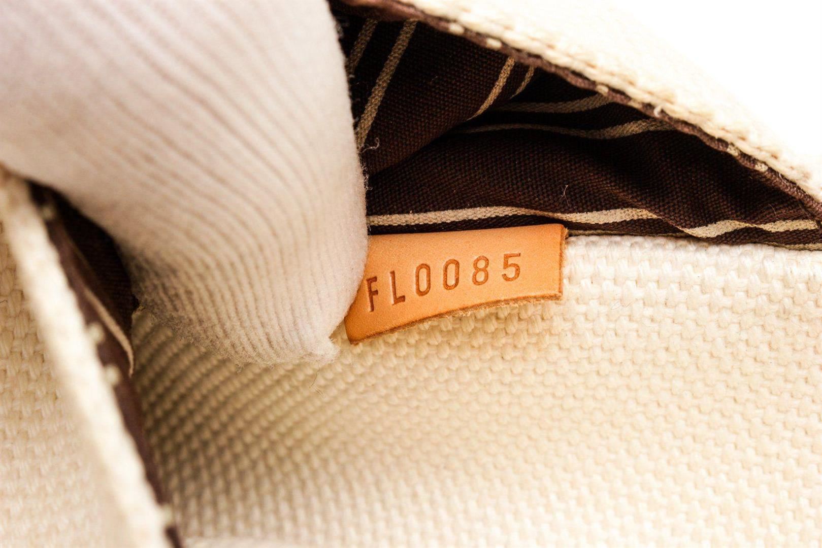 Louis Vuitton Beige Canvas Antigua Messenger Bag with brass hardware, single adjustable flat shoulder strap, logo placard at front flap, dual slip pockets under front flap, black and white striped woven interior lining and dual buckle closures at front flap.