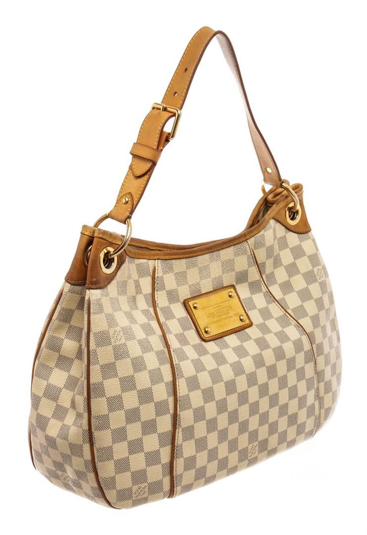 Louis Vuitton Beige Damier Azur Galliera PM Hobo Bag. All available information is listed in the description and shown in the photos. Louis Vuitton Beige Damier Azur Galliera PM Hobo Bag with neutrals coated canvas, damier azur pattern, brass hardware, leather trim, single adjustable shoulder strap, alcantara lining & dual interior pockets, protective feet at base, includes dust bag, snap closure at front. Height: 11" Width: 18" Depth: 4.5", Shoulder Strap Drop: 7.75" / 27.94 x 45.72 x 11.43 Cm