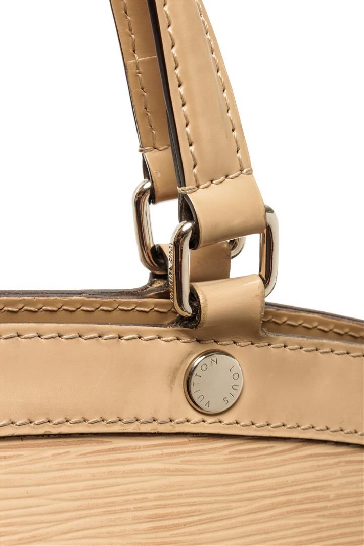 One Louis Vuitton Beige Epi Leather Brea MM Satchel Shoulder Bag. Item is sold AS-IS. All available information is listed in the description and shown in the photo. Beige Epi leather Louis Vuitton Brea MM bag with silver tone hardware, leather trim, brown canvas lining, three interior pockets (one with zipper closure, 2 slip pockets), embossed LV logo on front bottom corner, dual flat leather handles, detachable adjustable leather strap, and top zipper closure. .