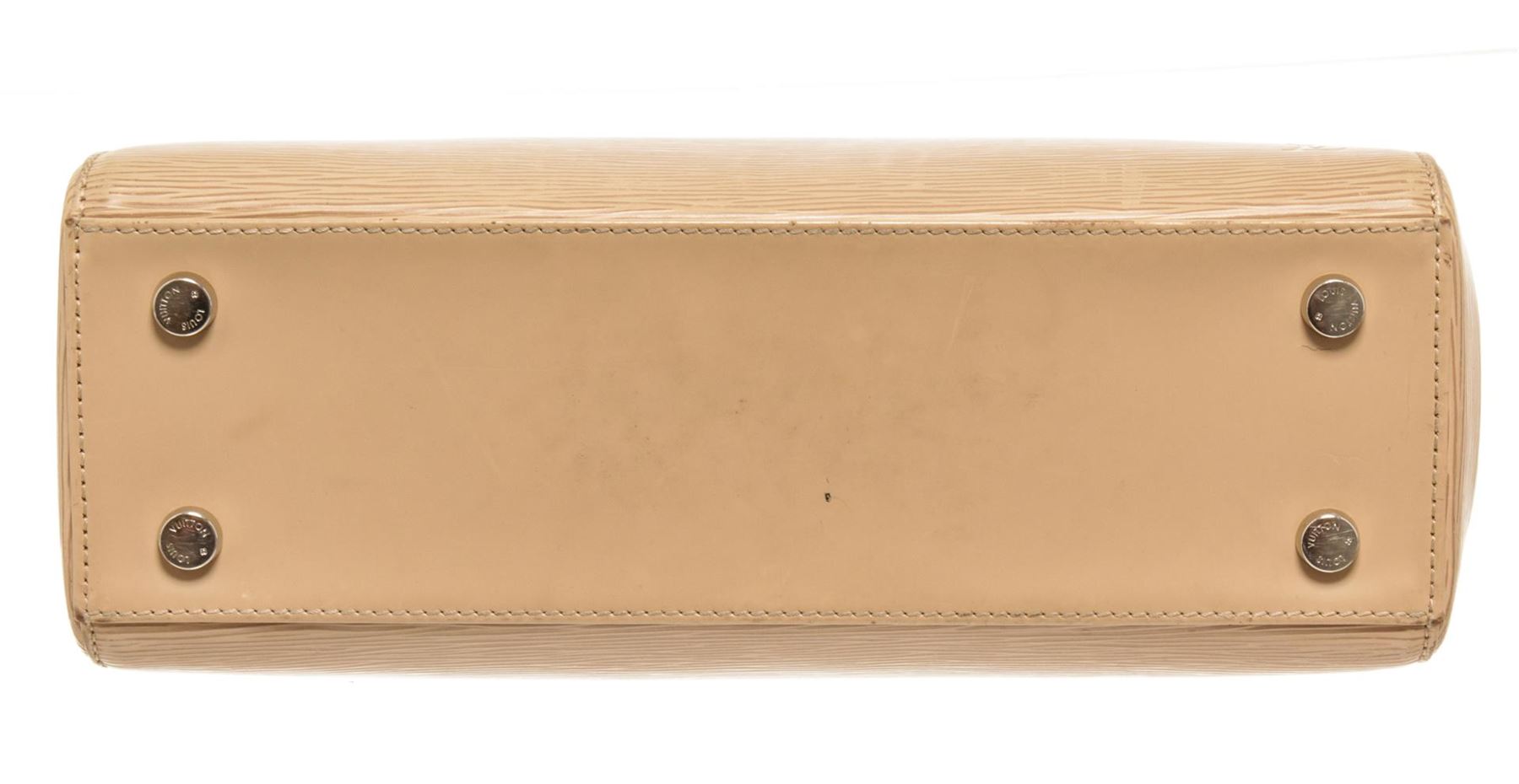 One Louis Vuitton Beige Epi Leather Brea MM Satchel Shoulder Bag. Item is sold AS-IS. All available information is listed in the description and shown in the photo. Beige Epi leather Louis Vuitton Brea MM bag with silver tone hardware, leather trim, brown canvas lining, three interior pockets (one with zipper closure, 2 slip pockets), embossed LV logo on front bottom corner, dual flat leather handles, detachable adjustable leather strap, and top zipper closure. .