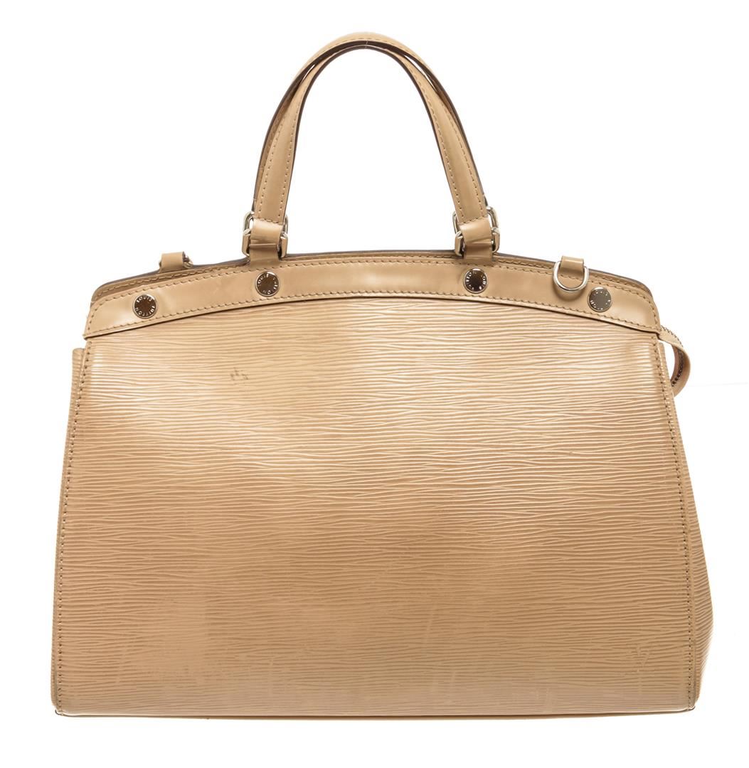 One Louis Vuitton Beige Epi Leather Brea MM Satchel Shoulder Bag. Item is sold AS-IS. All available information is listed in the description and shown in the photo. Beige Epi leather Louis Vuitton Brea MM bag with silver tone hardware, leather trim, brown canvas lining, three interior pockets (one with zipper closure, 2 slip pockets), embossed LV logo on front bottom corner, dual flat leather handles, detachable adjustable leather strap, and top zipper closure. .