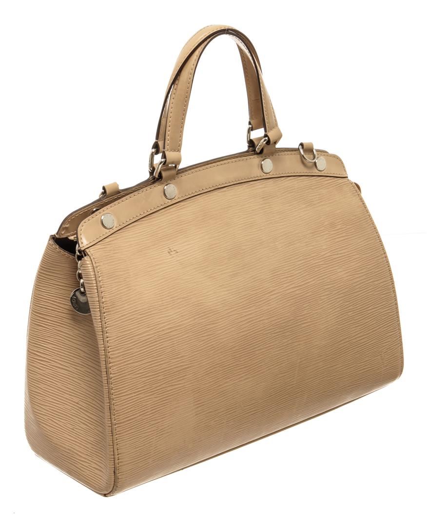 One Louis Vuitton Beige Epi Leather Brea MM Satchel Shoulder Bag. Item is sold AS-IS. All available information is listed in the description and shown in the photo. Beige Epi leather Louis Vuitton Brea MM bag with silver tone hardware, leather trim, brown canvas lining, three interior pockets (one with zipper closure, 2 slip pockets), embossed LV logo on front bottom corner, dual flat leather handles, detachable adjustable leather strap, and top zipper closure. .