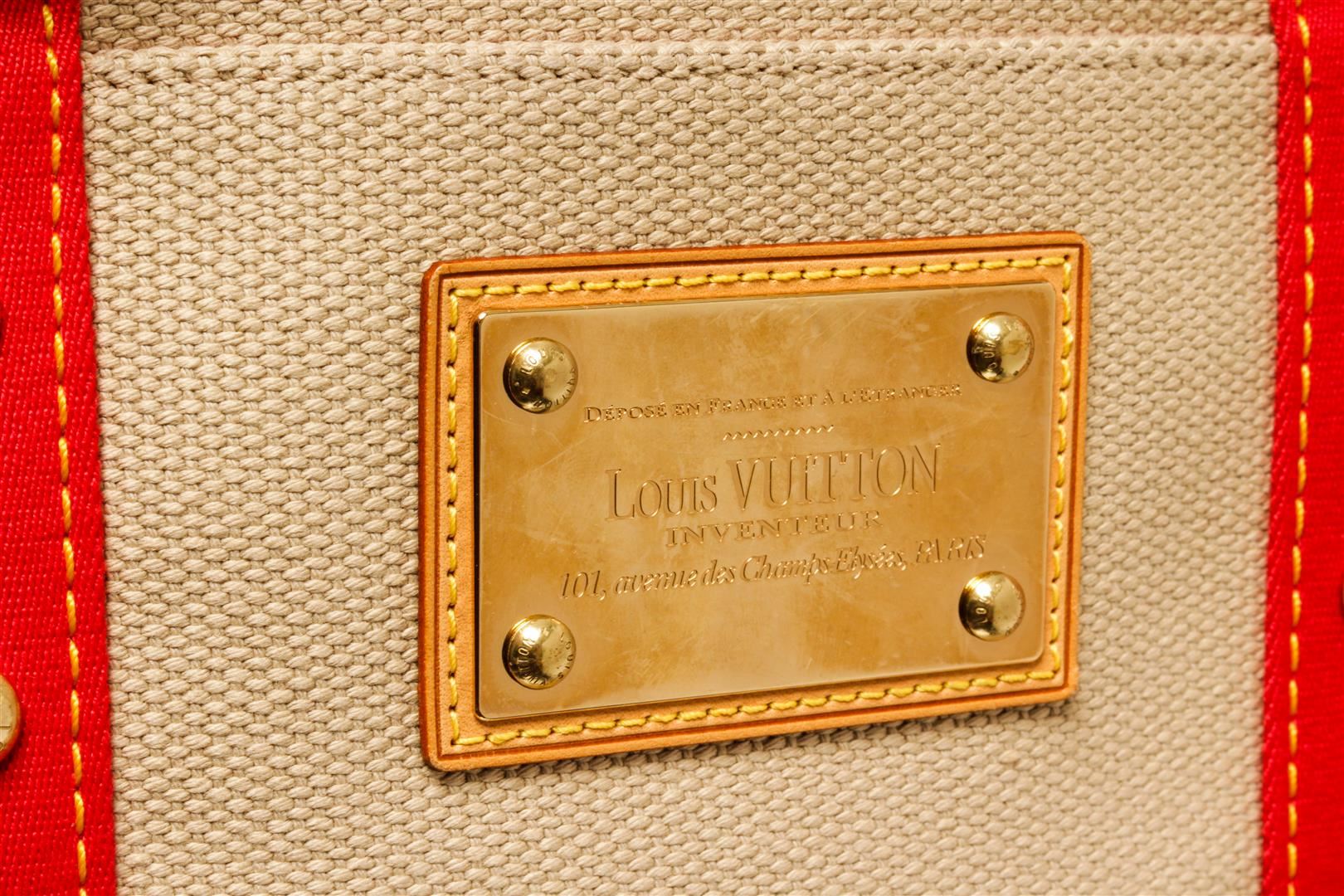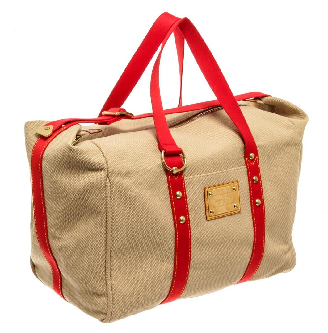 Louis Vuitton Beige Pink Canvas Sac Antigua Weekend Handbag. All available information is listed in the description and shown in the photos. Louis Vuitton Beige Pink Canvas Sac Antigua Weekend Handbag. Features gold hardware, red canvas straps, a red fabric interior, and a gold zipper closure.
