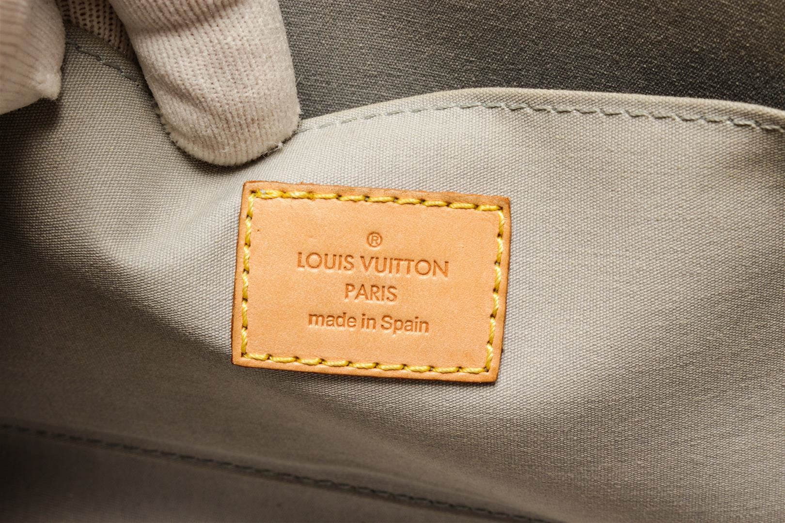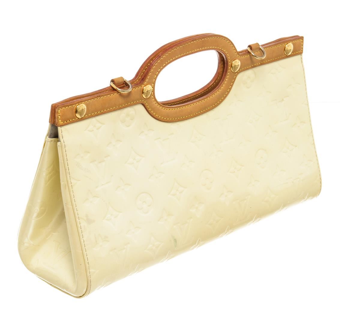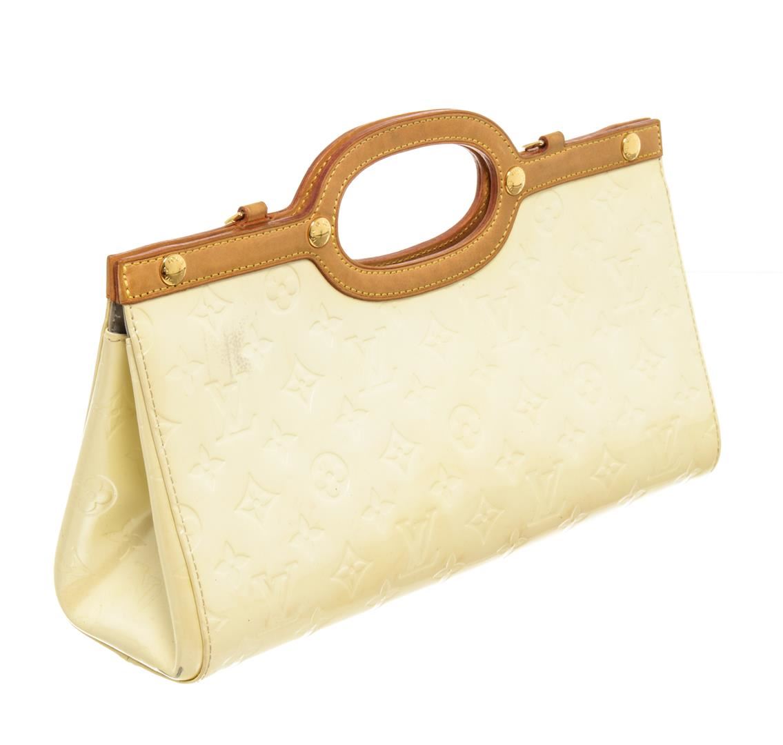 Louis Vuitton Beige Vernis Leather Roxbury Drive Handbag. All available information is listed in the description and shown in the photos. Louis Vuitton Beige Vernis Leather Roxbury Drive Handbag with gold tone hardware, tan leather trim, gray fabric lining, interior open pocket, and snap closure.