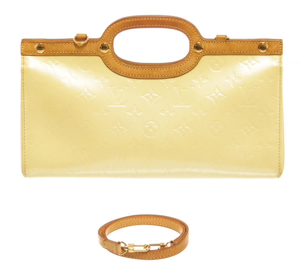 Louis Vuitton Beige Vernis Leather Roxbury Drive Handbag. All available information is listed in the description and shown in the photos. Louis Vuitton Beige Vernis Leather Roxbury Drive Handbag with gold tone hardware, tan leather trim, gray fabric lining, interior open pocket, and snap closure.