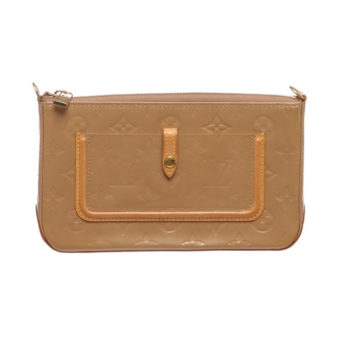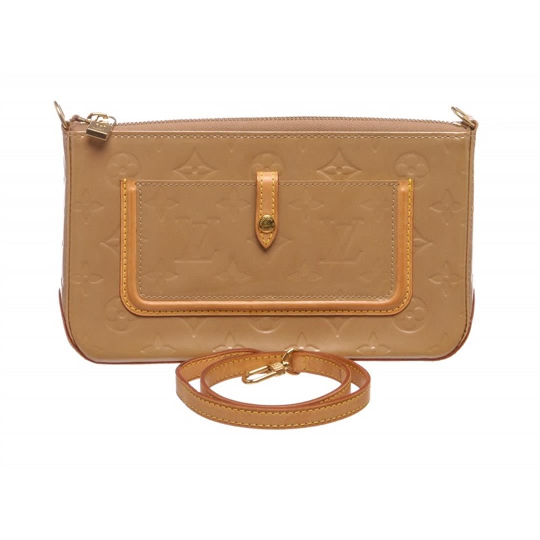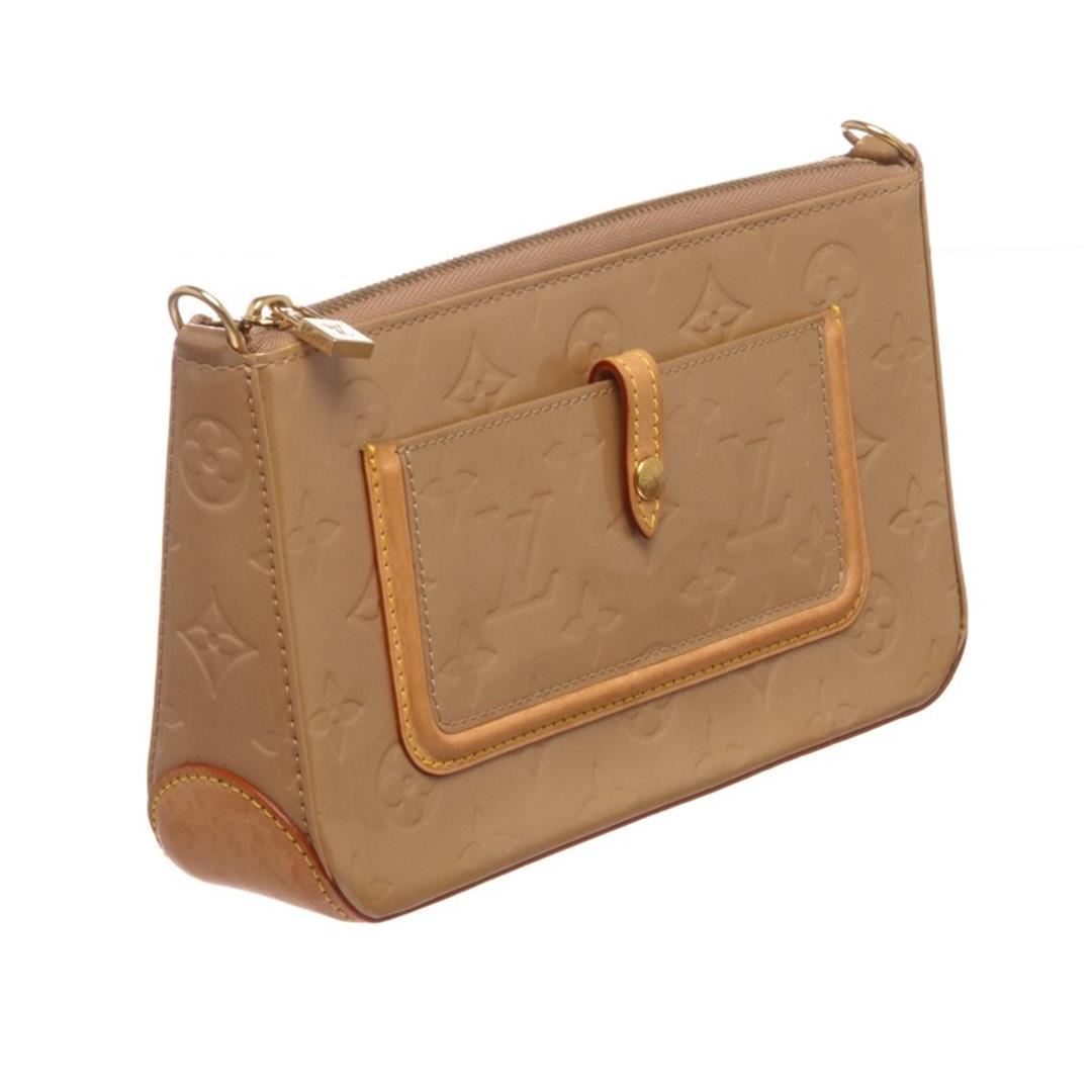 One Louis Vuitton Beige Vernis Mallory Bag. Tan Louis Vuitton monogram leather Vernis Mallory bag with flat front pocket, brass hardware, removable vachetta leather trim and strap, canvas lined interior and top zip closure. Item is pre-owned.