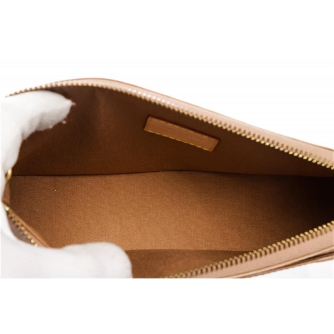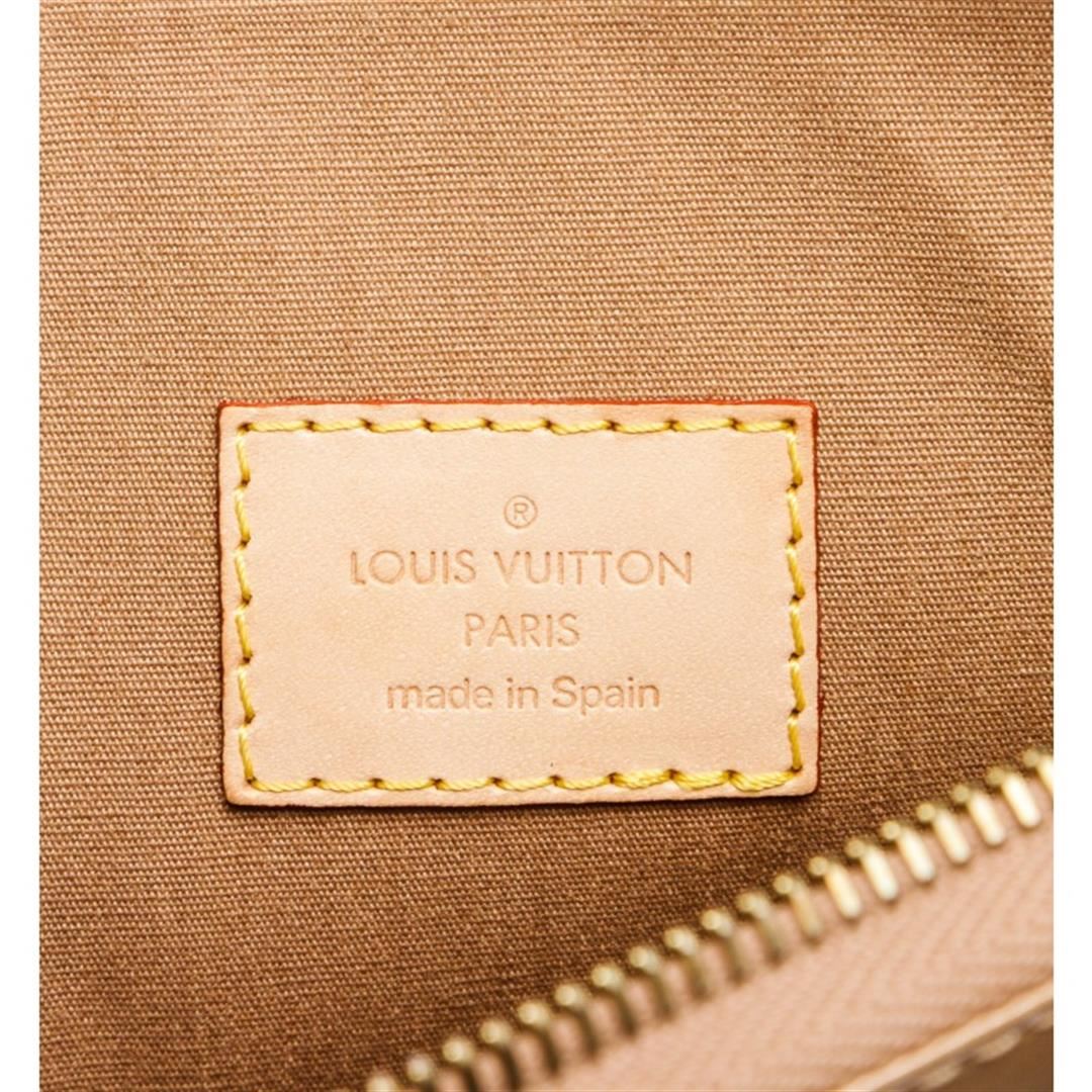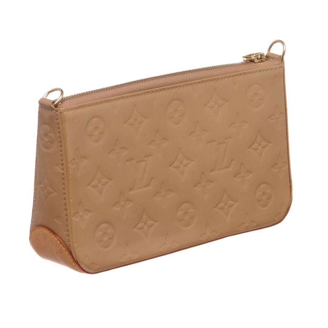 One Louis Vuitton Beige Vernis Mallory Bag. Tan Louis Vuitton monogram leather Vernis Mallory bag with flat front pocket, brass hardware, removable vachetta leather trim and strap, canvas lined interior and top zip closure. Item is pre-owned.