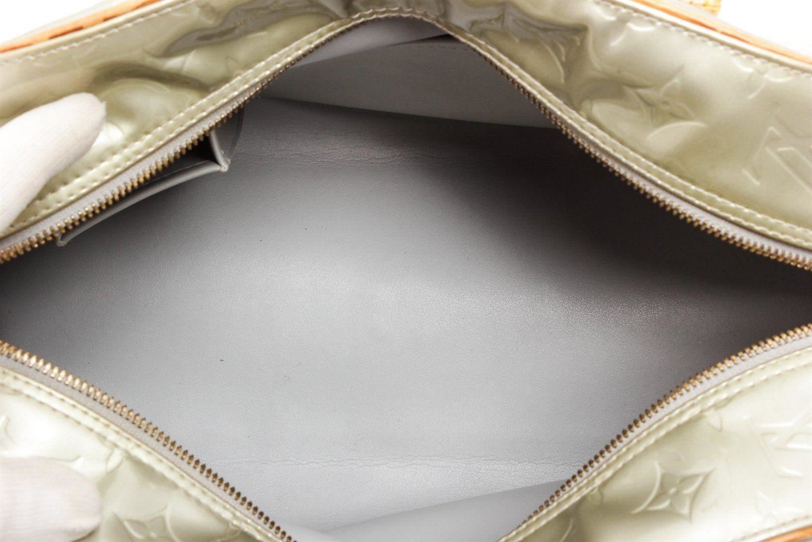 Louis Vuitton Beige Vernis Patent Leather Tompkins Satchel Bag with tan vachetta leather trim, brass hardware, dual rolled top handles, single exterior pocket, leather lining, dual pockets at interior wall and two-way zip closure at top.