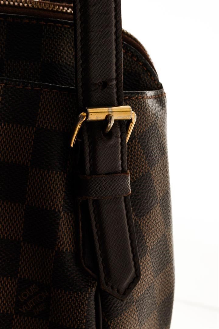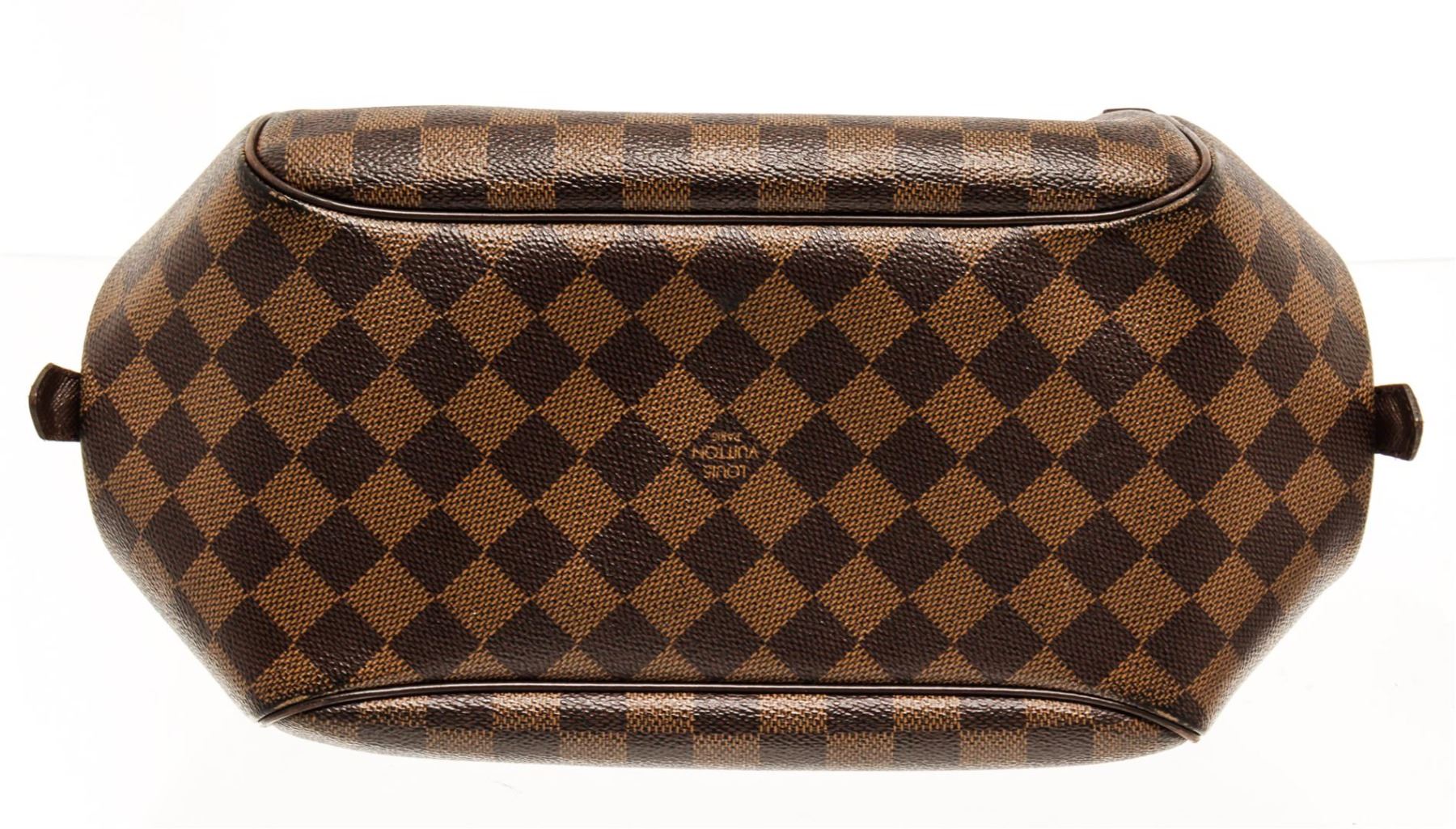 One Louis Vuitton Belem Damier Ebene MM. Item is sold AS-IS. All available information is listed in the description and shown in the photo. Louis Vuitton Belem Damier Ebene MM with brown top handle, red fabric lining, one slip interior pocket, and gold-tone hardware. 7679