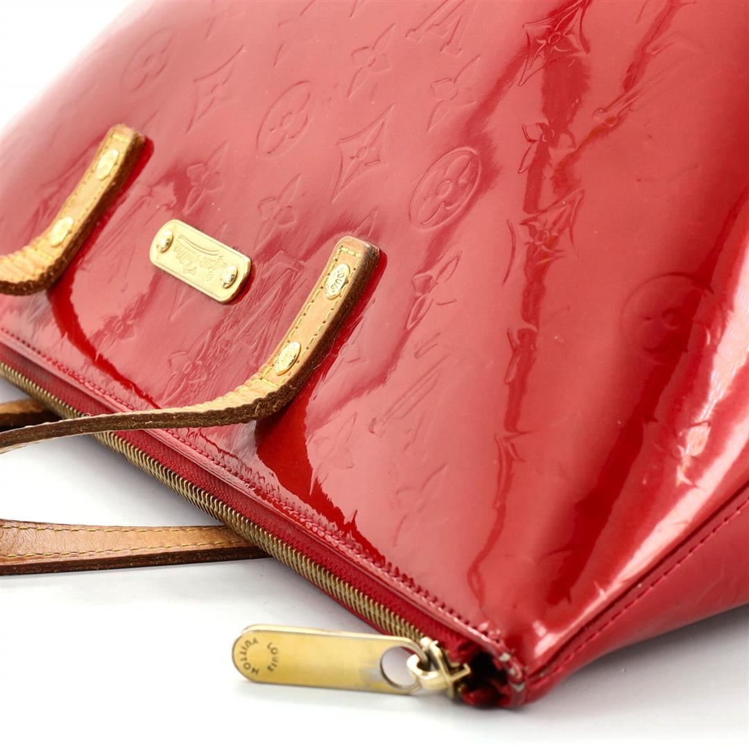 Louis Vuitton Bellevue Handbag Monogram Vernis GM. Heavy odor in interior. Wear and scuffs on exterior, heavy wear on base and base corners, moderate darkening, wear, creasing, scuffs and watermarks on handles. Darkening on zipper tape, moderate darkening