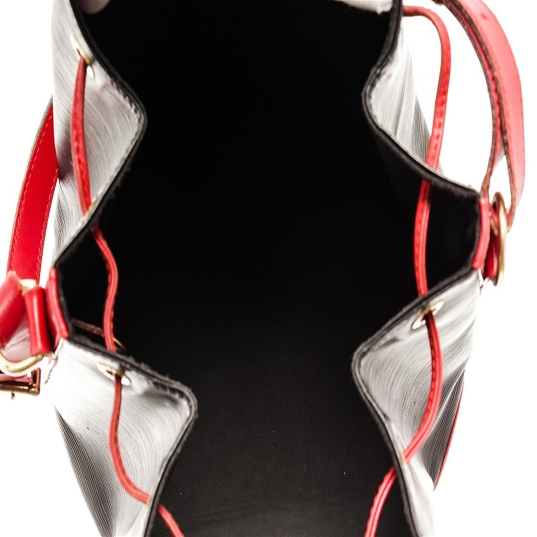 One Louis Vuitton Black And Red Epi Leather Noe Shoulder Bag. Item is sold AS-IS. All available information is listed in the description and shown in the photo. Louis Vuitton black and red epi leather Noe shoulder bag with this vintage 1991 features a bicolor epi leather body, an adjustable shoulder strap, and a top red leather drawstring closure and interior zipper pocket. such a great color combination bag from the 90s. The leather strap is peeling, the leather is cracking on the strap and hardware is tarnished as shown in pictures. Height: 10.23" Width: 13.38" Depth: 7.08" , Shoulder Drop: 20.07" / 26 x 34 x 18 Cm